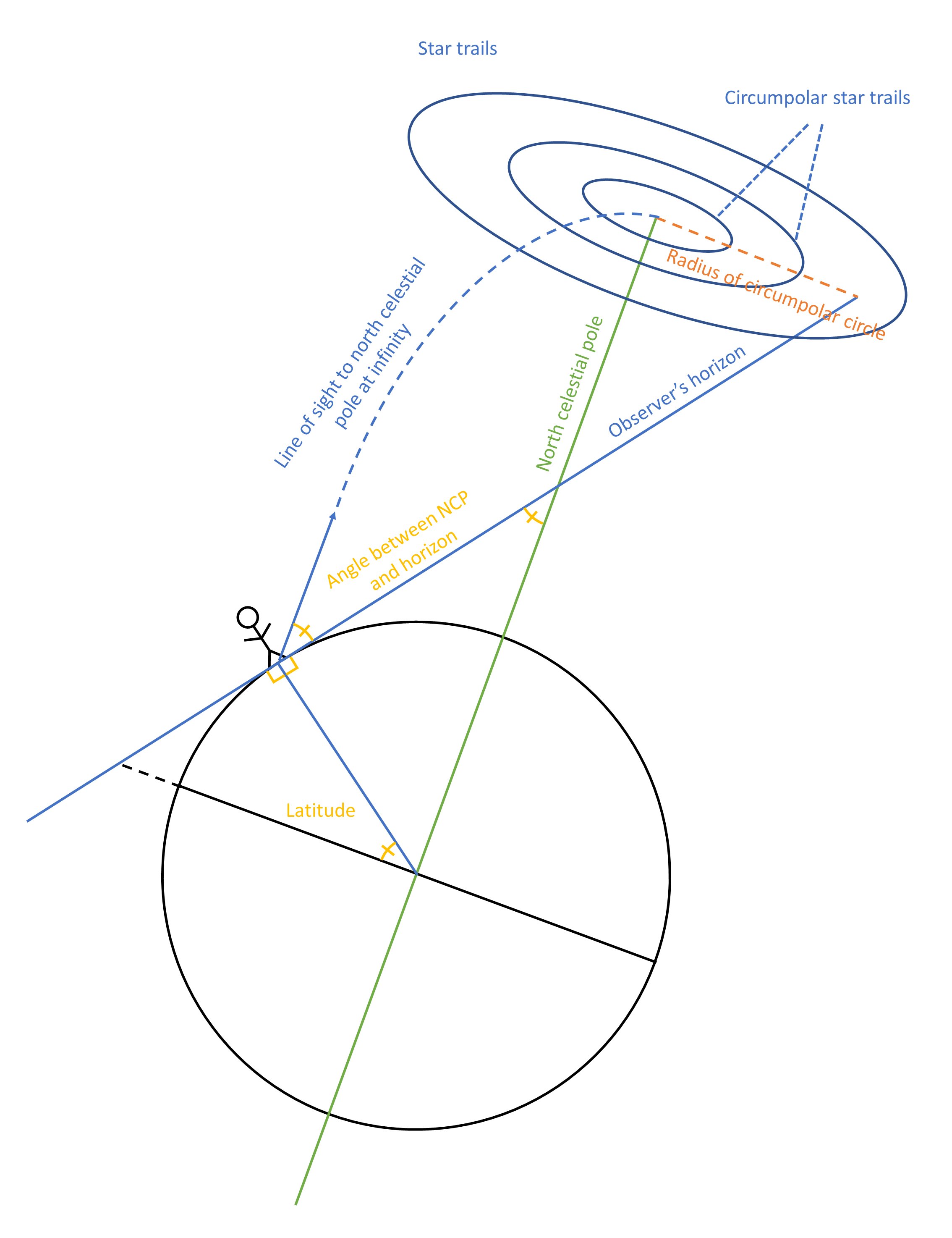 지구상에서 관측자의 위도에 따라 일부 별(주극성)은 천극에 충분히 가까워서 지평선 위에 계속 남아 있지만, 다른 별들은 일일 원형 경로의 일부 동안 지평선 아래로 내려간다.[1]