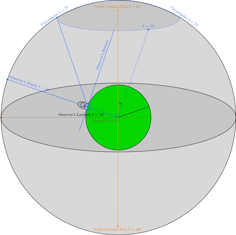 - 남반구 관측자의 경우, δ - θ > +90° 이면 해당 별은 지평선 위로 뜨지 않는다.[4]