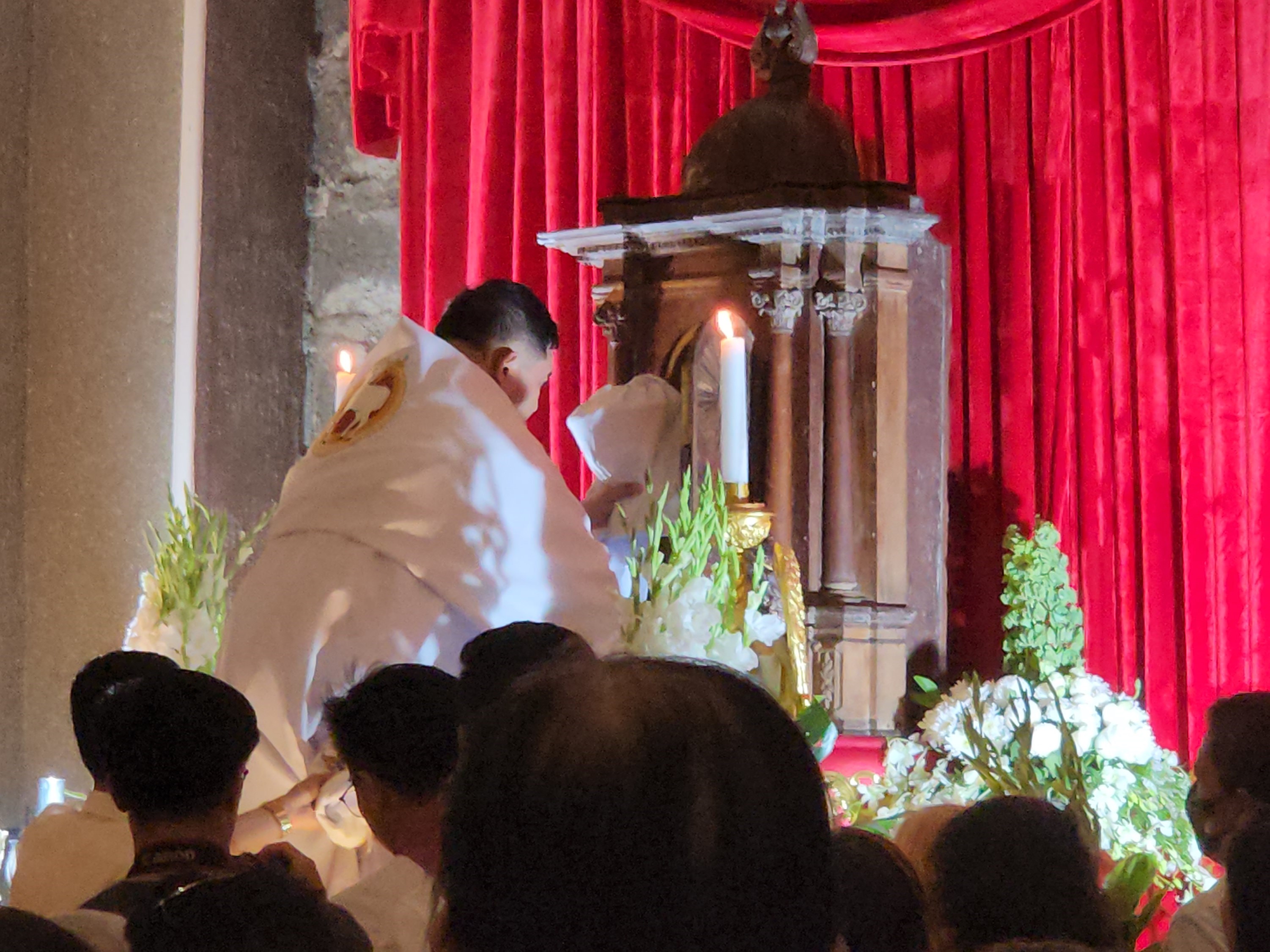 안치소 제대에 도착하면, 사제는 성체가 담긴 그릇을 감실에 넣고 문을 열어 둔다. তারপর 향을 피우고 감실 문을 닫는다. 잠시 묵상한 후, 사제와 복사들은 침묵 속에 퇴장한다.[21] 성 목요일에 티암트 에르고를 장엄하게 바치면 신자들에게 전대사가 부여된다.[22]