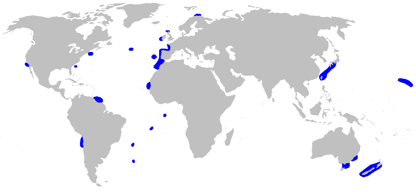 서태평양에서는 일본 혼슈 남동부에서 타이완, 중국 연안, 오스트레일리아 뉴사우스웨일스주 연안, 타즈마니아와 뉴질랜드 제도에 이르는 지역에 분포한다. 중앙 및 동태평양에서는 미국 하와이와 캘리포니아 연안, 남아메리카 서부의 칠레 북부 연안 해역에서 발견된다.[1]