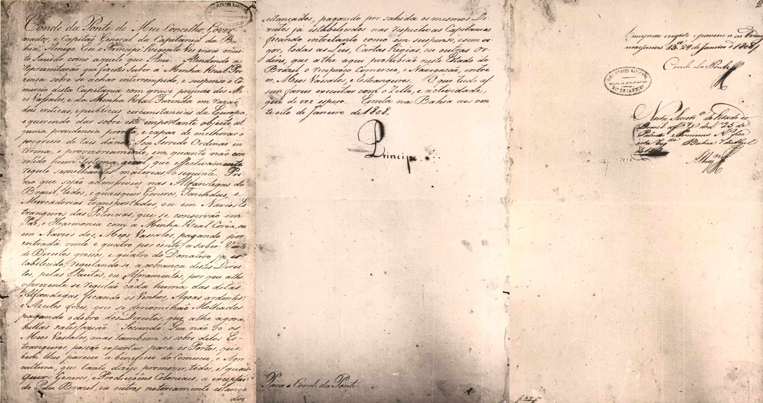 1808년 1월 22일, 주앙 왕세자가 탄 배를 포함한 함대가 브라질의 바이아두스산투스 만에 도착했다. 처음에는 살바도르 총독이 왕세자의 허락 없이 백성들이 그를 맞이하는 것을 주저했으나, 주앙은 모든 이들이 자유롭게 환영할 수 있도록 허락했다.[27] 다음 날, 왕실 일행은 성대한 환영 행렬과 살바도르 대성당에서의 ''테 데움'' 축하 속에서 상륙했다. 주앙은 며칠간 자신에게 경의를 표하러 온 모든 이들을 받아 ''베이자망''(군주의 손에 입맞추는 의식)을 베풀고 여러 혜택을 하사했다.[28] 이 시기 중요한 조치 중 하나는 경제학 강좌 개설과 외과 학교 설립 포고령이었다.[29]