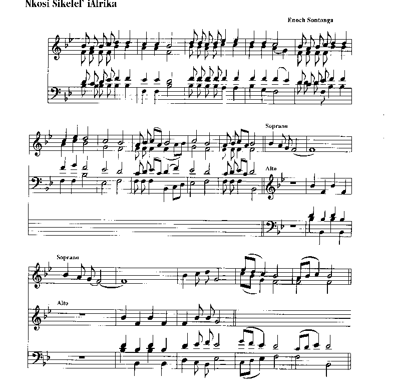 Nkosi Sikelel' iAfrika|italic=noxh는 1897년 요하네스버그 근처 감리교(Methodism) 선교 학교의 교사였던 에녹 손통가(Enoch Sontonga)가 작곡한 코사어 찬송가이다.[3] 1927년에는 시인 사무엘 음카이(Samuel Mqhayi)가 코사어 가사를 7절 추가했다.[5][3]