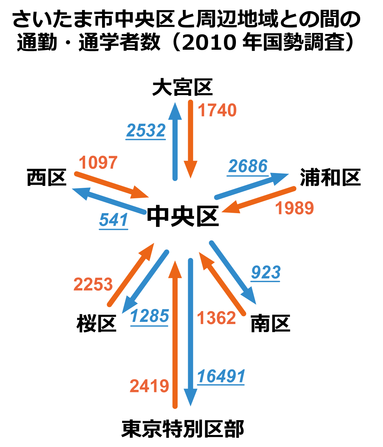 도쿄 도심부에서 약 25km 거리에 있어 도쿄의 교외 도시로서의 성격이 강하다.[28] 동시에 우라와구나 오미야구로의 통근·통학자도 많아, 이들 지역에 대한 교외로서의 특징도 지닌다.[28] 니시구나 사쿠라구에 대해서는, 중앙구에서 유출되는 통근·통학자보다 중앙구로 유입되는 통근·통학자가 더 많다.