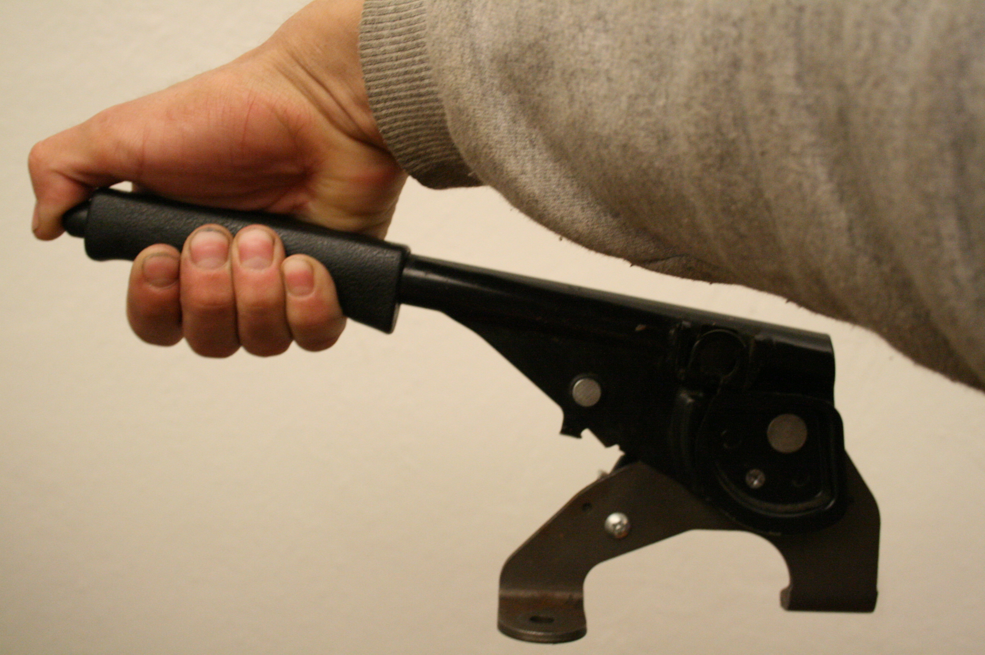 일반적으로 많이 볼 수 있는 방식으로, 손으로 당기면 주차 브레이크가 체결되고 상단 끄트머리 버튼을 누른 상태에서 레버를 내리면 해제된다. 생산 단가가 적게 들어가며, 기계식으로 작동하여 신뢰성이 높다. 주로 중형급 미만의 승용차와 소형 상용차에 많이 사용된다.[28] 운전석과 조수석 사이의 센터 콘솔에 위치하는 것이 일반적이다. 브레이크를 작동시키려면 레버를 위로 당겨 장력을 걸리게 한다. 브레이크를 해제하려면 버튼을 누른 상태에서 레버를 위로 당겨 래칫을 해제한 다음, 버튼을 계속 누른 채로 완전히 아래로 밀어 넣는다.[29]2. 1. 2. 케이블 파킹식