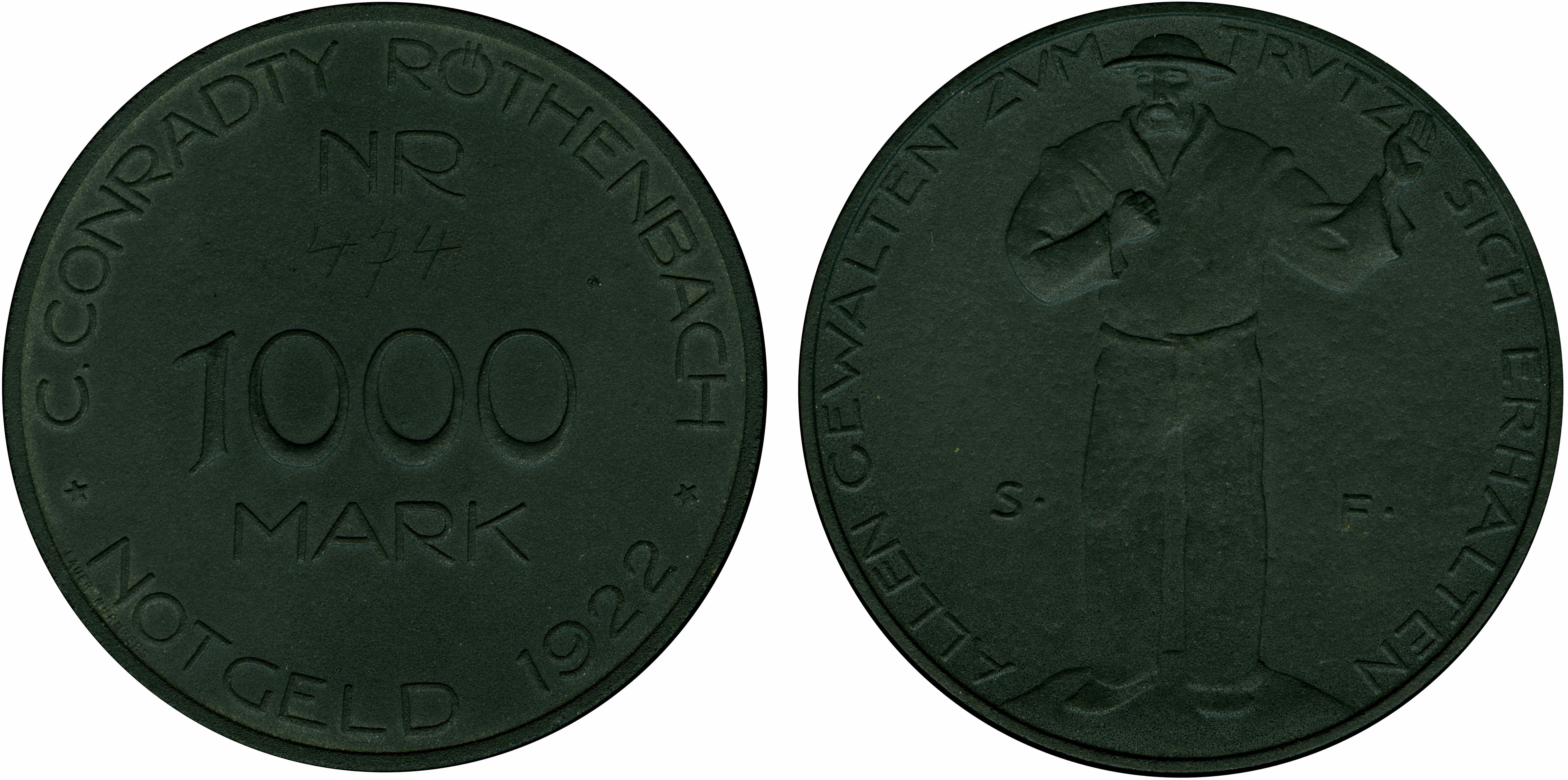 목탄 또는 유사 재료 | ![]() | 1000 마르크 개인 노트겔트, 콘라디티 컴퍼니, 1922년 |