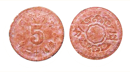 섬유 | ![]() | 1 및 5 펀 동전, 만주국, 1944–45년. |