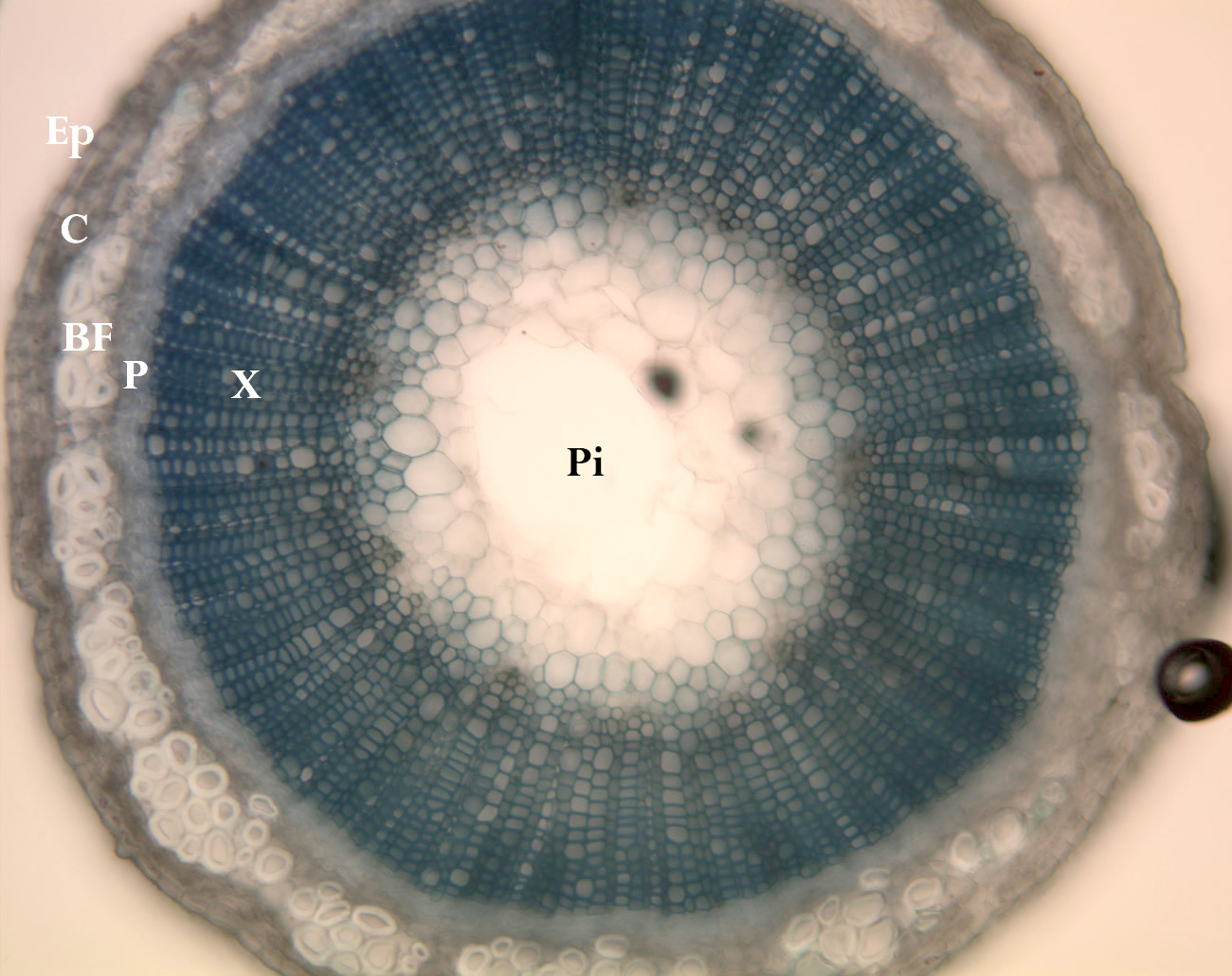 내부 구조 | 겉껍질(epidermis): 줄기의 가장 바깥층으로, 보호 역할을 한다. 피층(cortex): 겉껍질 안쪽에 있으며, 유세포로 구성되어 있다. 관다발(vascular bundle): 물관과 체관으로 구성되어 있으며, 물과 영양분을 운반한다. 속(pith): 줄기 중앙에 있으며, 유세포로 구성되어 있다. |