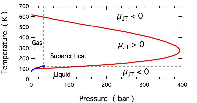 줄-톰슨 팽창 중 온도 변화 정도는 줄-톰슨 계수 로 나타낸다. 이 계수는 압력 변화에 따른 온도 변화율()을 의미하며, 엔탈피가 일정한 조건에서 측정된다. 가 양수이면 온도가 내려가고(냉각), 음수이면 온도가 올라간다(가열). 0이면 온도는 변하지 않는다. 질소(N2)의 경우, 그림에서 볼 수 있듯이 특정 온도와 압력 범위에서는 냉각 효과()가 나타나지만, 매우 높거나 낮은 온도, 또는 매우 높은 압력에서는 가열 효과()가 나타난다. 특정 압력에서 의 부호가 바뀌는 온도를 반전 온도라고 한다. 질소의 최대 반전 온도는 약 621 K이다.[10] 따라서 621 K 미만의 온도에서 질소 기체를 줄-톰슨 팽창시키면 액체 질소를 얻을 때까지 냉각시킬 수 있다.