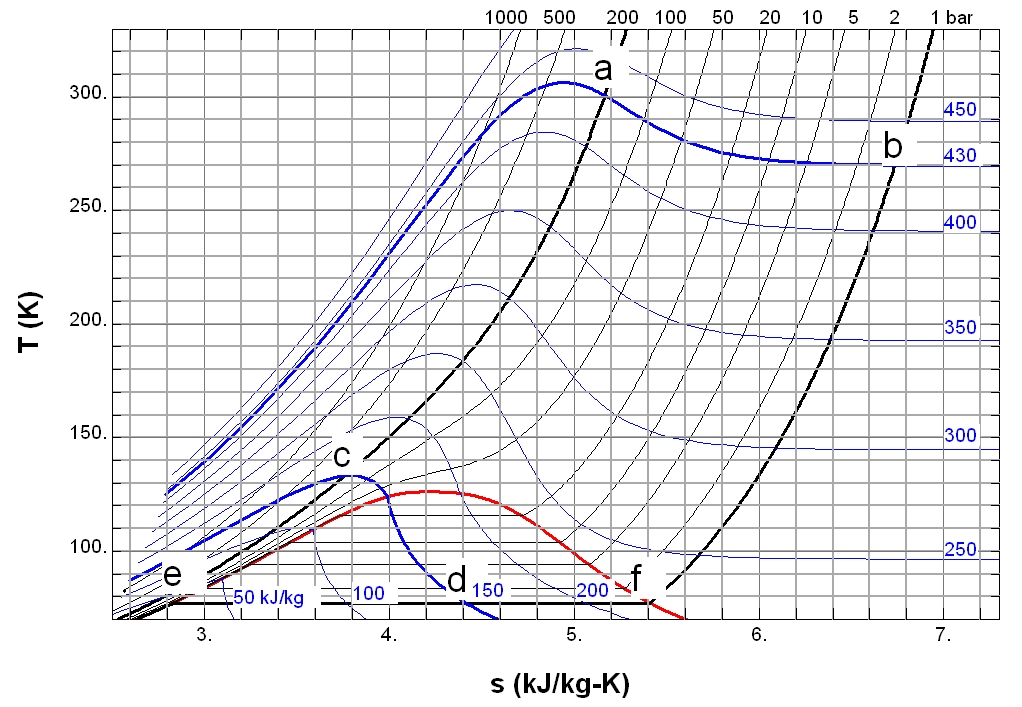 # ''T'' = 133 K, ''p'' = 200 bar, ''s'' = 3.75 kJ/(kg·K), ''h'' = 150 kJ/kg;