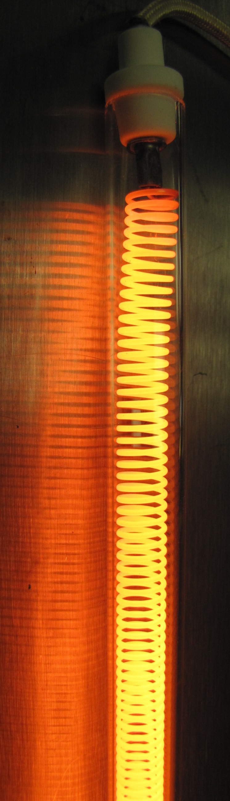 방사 가열 요소(열 램프)는 대부분 가시광선 대신 적외선을 방출하기 위해 최대 전력 미만으로 작동하는 고출력 백열 전구이다. 이것들은 일반적으로 복사열 공간 히터와 음식 보온기에 있으며, 길고 튜브 형태이거나 'R40' 반사경 램프 형태이다. 반사경 램프 스타일은 생성되는 가시광선을 최소화하기 위해 종종 빨간색으로 착색된다. 튜브 형태는 다음과 같은 다양한 형식으로 제공된다.- 금 코팅Gold coated영어—특허받은 필립스 헬렌 램프로 유명해졌다. 금 이색성 필름이 내부에 증착되어 가시광선을 감소시키고 단파 및 중파 적외선의 대부분을 통과시킨다. 주로 사람을 난방하는 데 사용된다. 현재 많은 제조업체에서 이 램프를 제조하고 있으며 지속적으로 개선되고 있다.