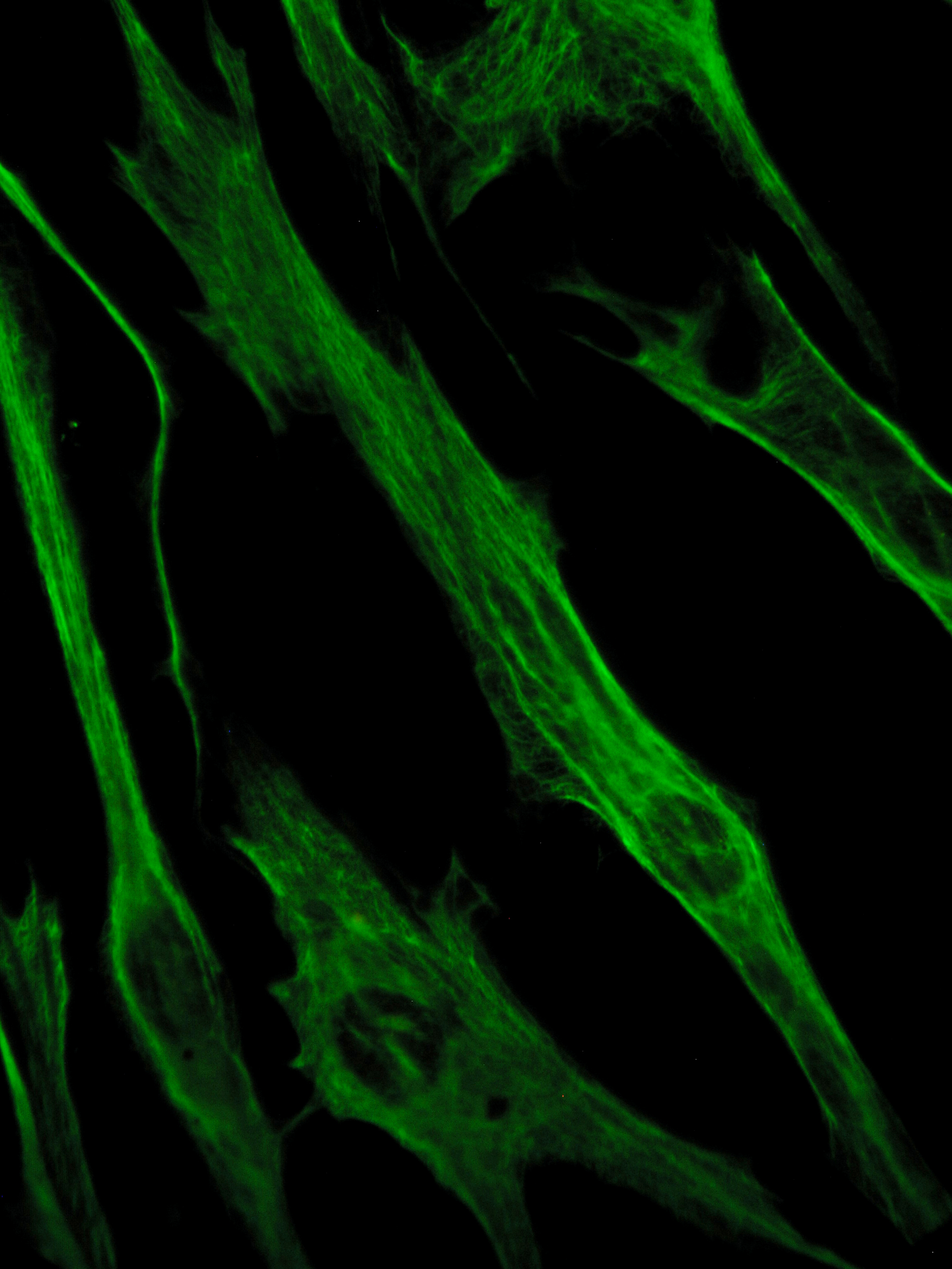 - '''비멘틴''': 모든 중간 섬유 단백질 중 가장 널리 분포되어 있으며, 섬유아세포, 백혈구, 혈관 내피 세포에서 발견될 수 있다. 이들은 세포막을 지지하고, 일부 세포소기관을 세포질 내의 고정된 위치에 유지하며, 막 수용체 신호를 핵으로 전달한다.[37] [6]