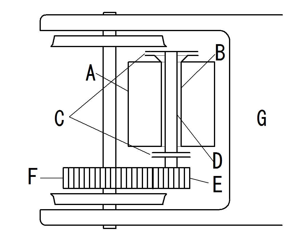 주 전동기는 차륜에 평행하게 배치되어 대차 틀에 지지되어 있으며, 주 전동기의 전기자 축을 굵은 중공축으로 하고, 그 양단에 플렉시블 디스크 커플링을 장착한다. 중공축 안에는 하나의 구동축 (토션 샤프트)을 통과시키며, 동력은 중공축 → 주 전동기 출력축 반대쪽 플렉시블 디스크 커플링 → 중공축 안의 구동축 → 주 전동기 출력축 측 플렉시블 디스크 커플링 → 피니언 기어로 전달된다.[1]