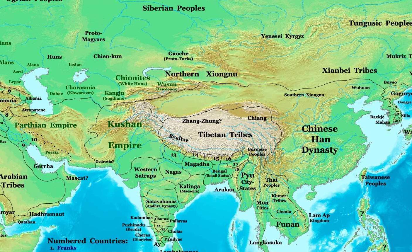 빨강: 티베트 불교 출현 전의 북방 전파 경로