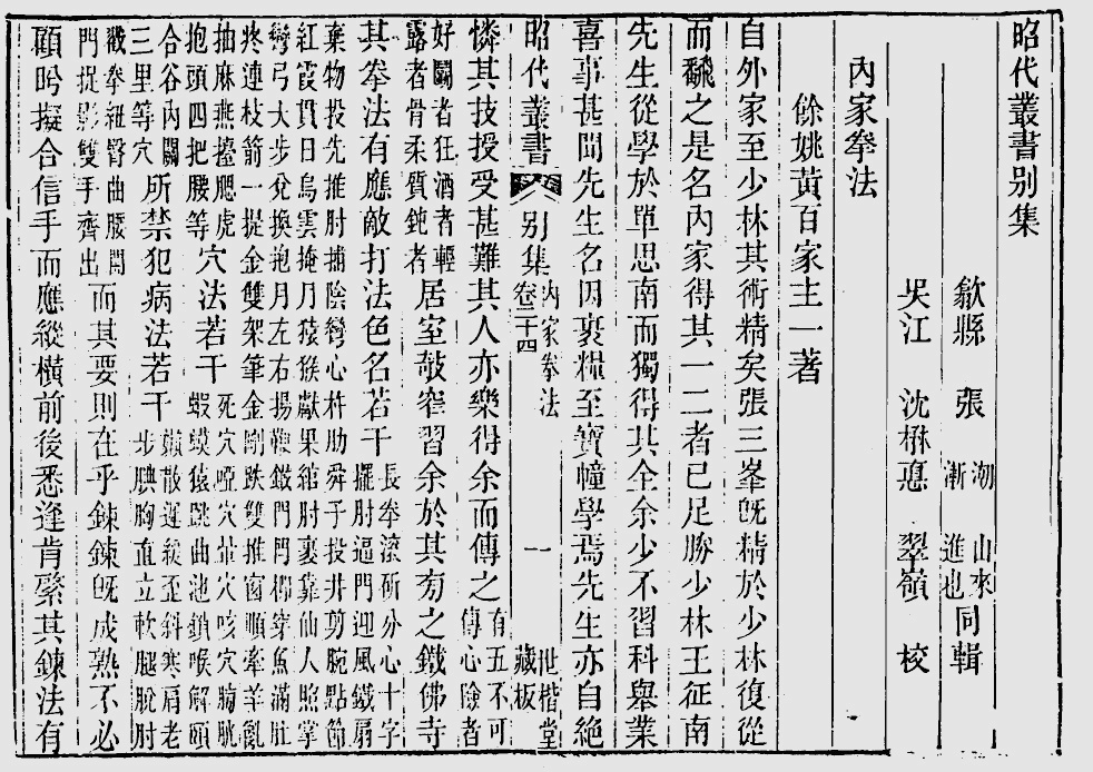 고증학의 시조인 황종희가 기록한 왕정남 묘지명에는, 내가권은 북종 시대의 장삼봉을 시조로 하고, 왕정남은 그 사용자라고 적혀있다. 그 권법의 상세 내용은 황종희의 아들인 황백가가 "내가권법"[80]에 기록하고 있다. 내가권과 태극권, 기효신서의 권경과의 관계를 고찰하는 연구가 있다[81]。
