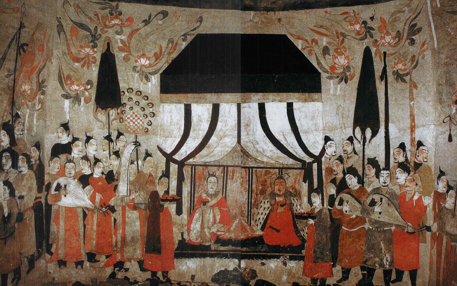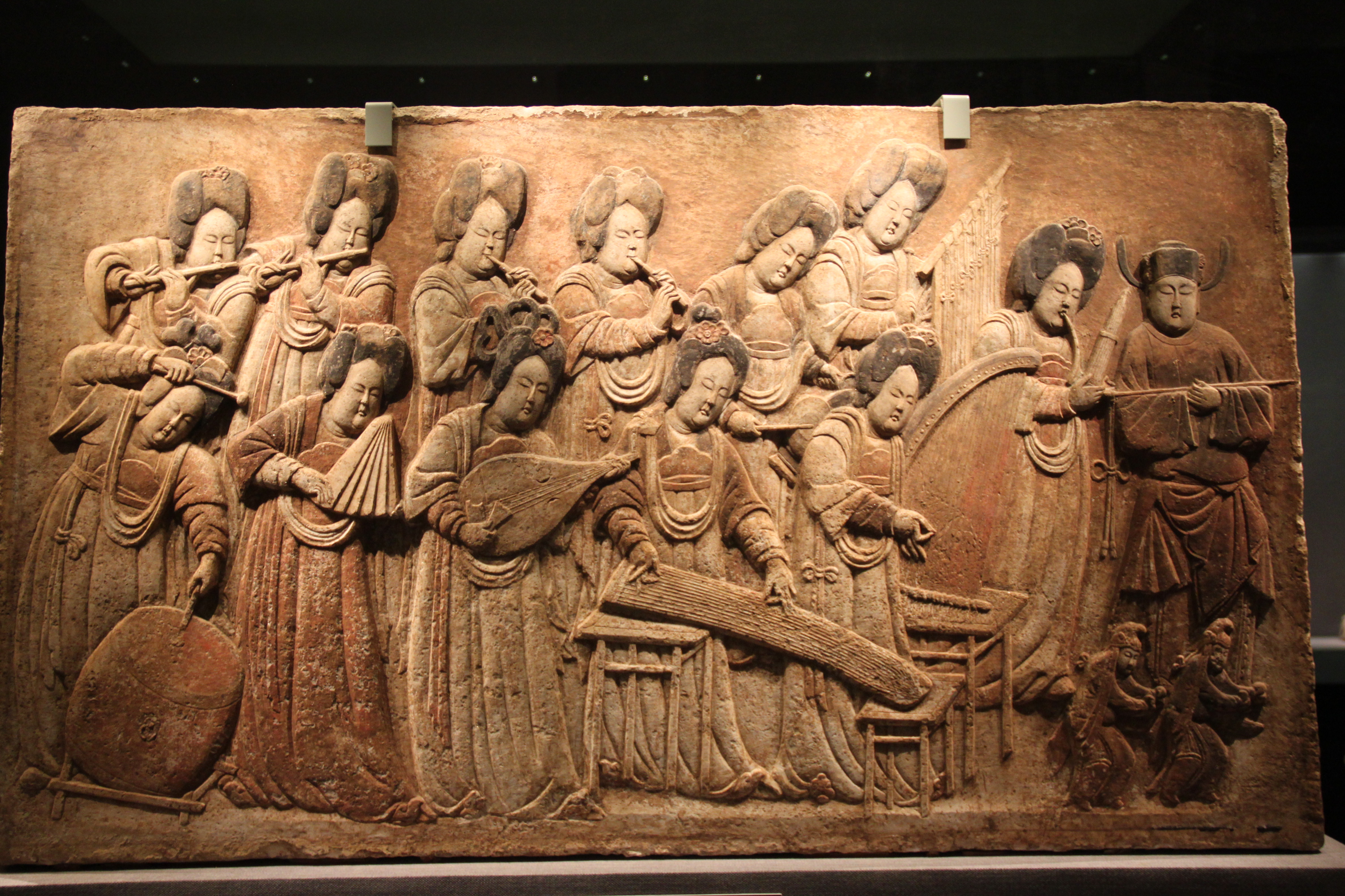 - 국제 음악의 시대 (4세기 ~ 10세기): 수나라, 당나라 시대에 서역을 통해 인도, 이란, 그리스 등 다양한 지역의 음악이 유입되어 중국 고유 음악과 융합되면서 국제적인 성격을 띠게 된 시기이다. 비파와 같은 중앙아시아 악기들이 도입되었고,[12] 수나라에서는 칠부기(七部伎)와 구부기(九部伎)가 융성하여 국제적인 성격이 강해졌다. 당나라에서는 태종 때 십부기(十部伎)를 만들고, 현종 때 입부기(立部伎)와 좌부기(左部伎)로 나누는 등 향연악이 크게 발달했다.
