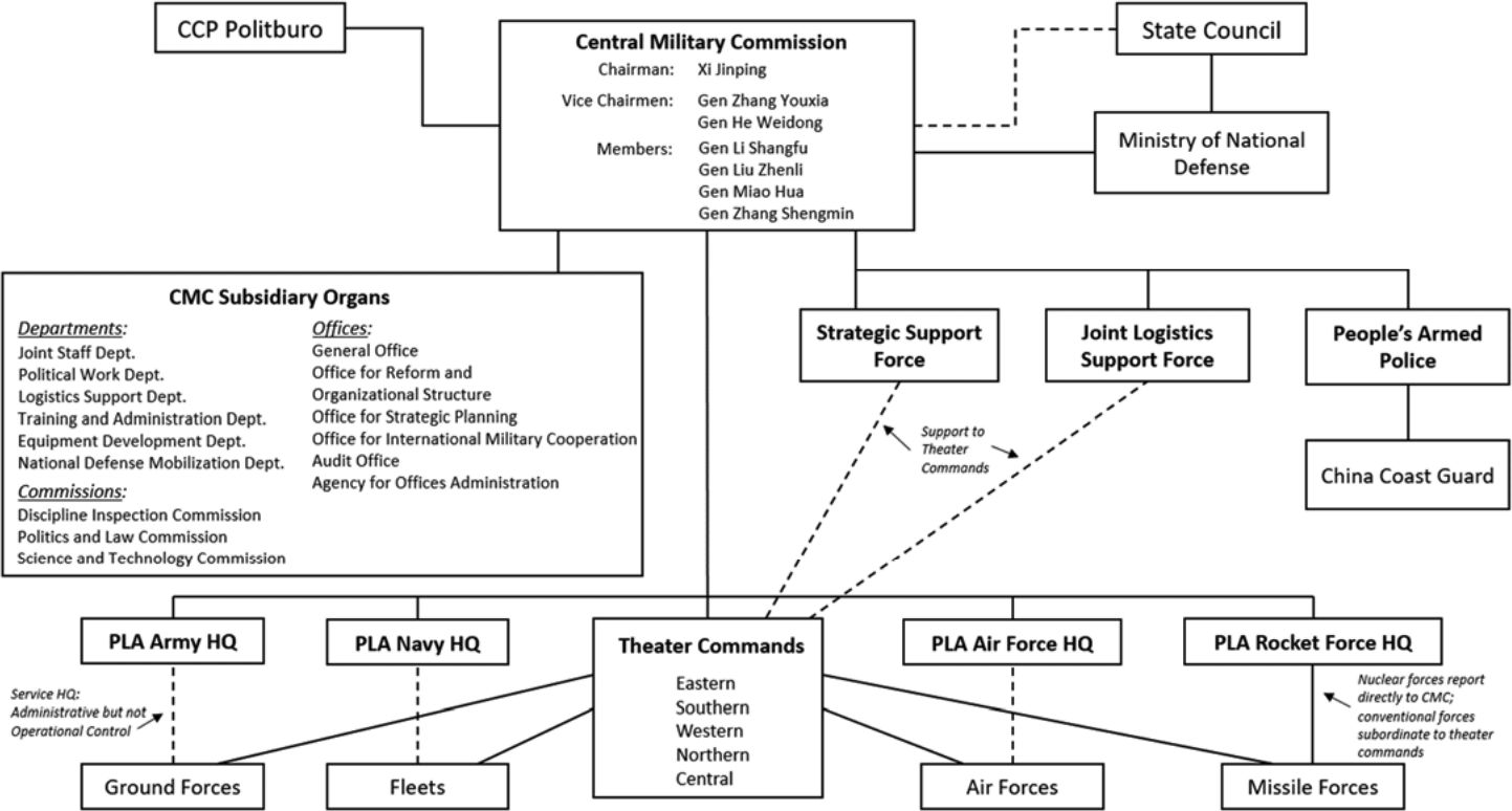 부대 | [[파일:Flag of the People's Liberation Army.svg|23x17px|border]] 항공우주군 [[파일:Flag of the People's Liberation Army.svg|23x17px|border]] 사이버 공간 부대 [[파일:Flag of the People's Liberation Army.svg|23x17px|border]] 정보 지원 부대 [[파일:Flag of the People's Liberation Army.svg|23x17px|border]] 합동 군수 지원 부대 |