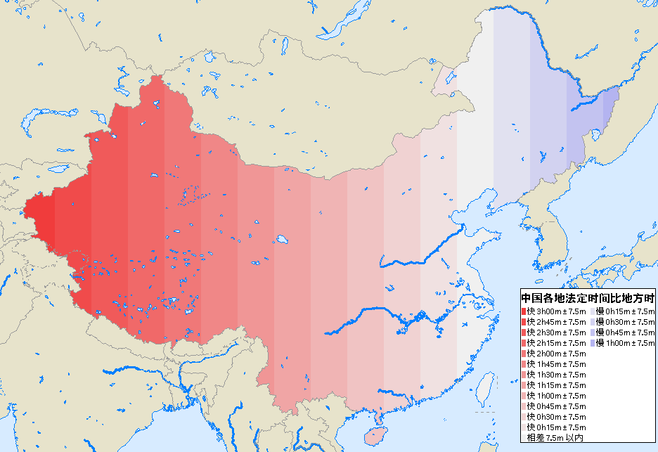 광서 28년(1902년), 청나라 정부는 동경 120도의 표준시를 “해안시(海岸時)”로 제정했다. 1912년, 베이징 중앙기상대는 전국을 다음 5개의 시간대로 구분했다.