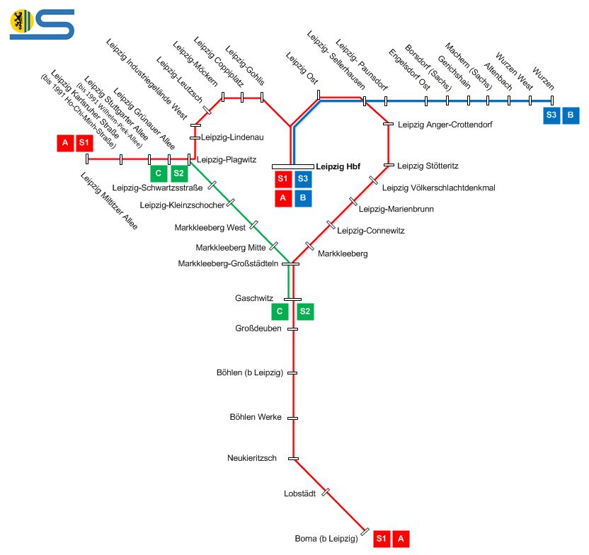 S3 | 할레(잘레) - 글로에베르스 - 슈코이디츠 - 라이프치히 고리스 - 라이프치히 - 라이프치히 MDR - 라이프치히 코네비츠 - 마르크클레베르크 - 마르크클레베르크 가슈비츠 |