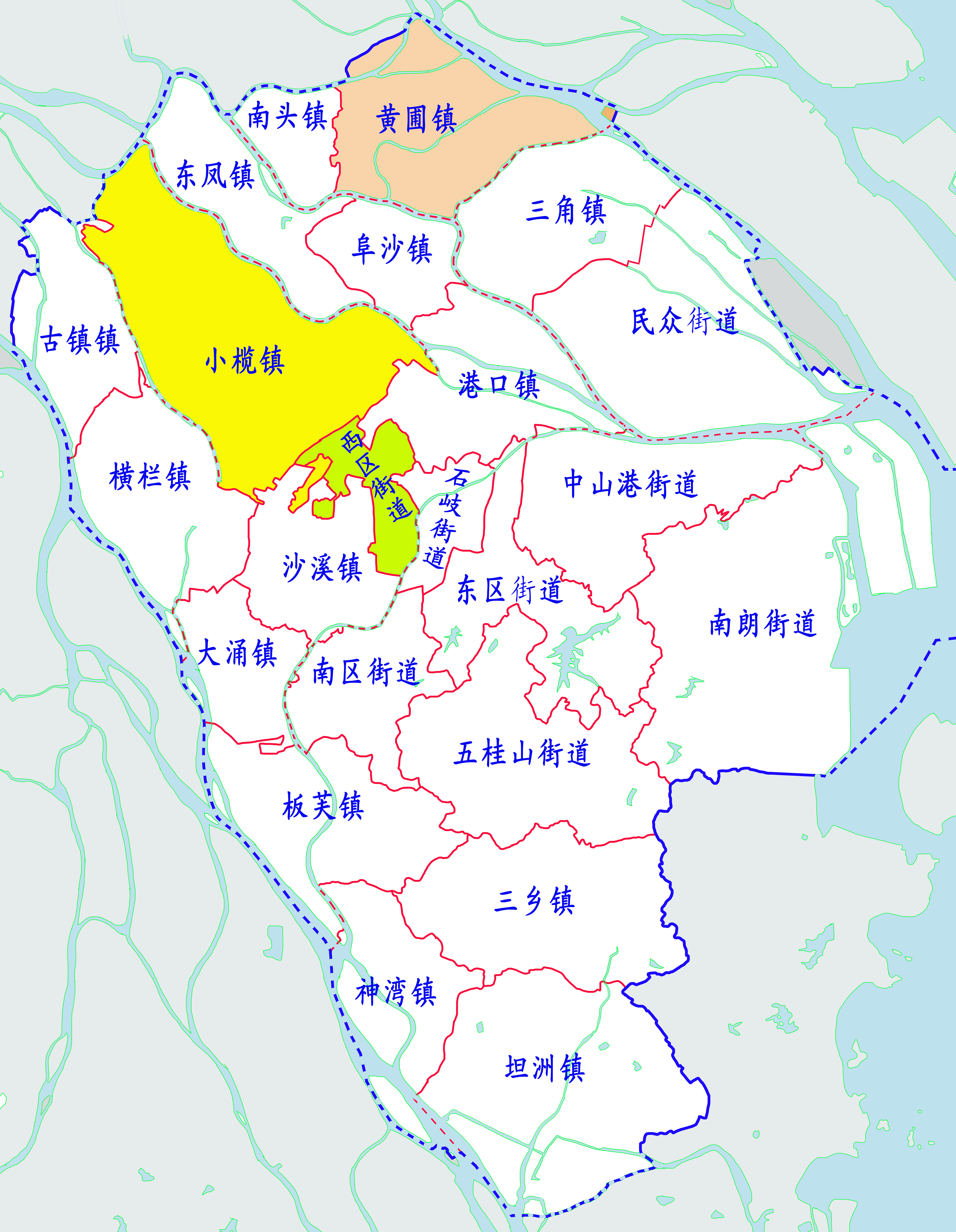 1983년, 중산은 포산의 행정구역 하에 있는 현급시로 행정 지위가 격상되었다. 1988년 중산은 지급시가 되었다.[25]