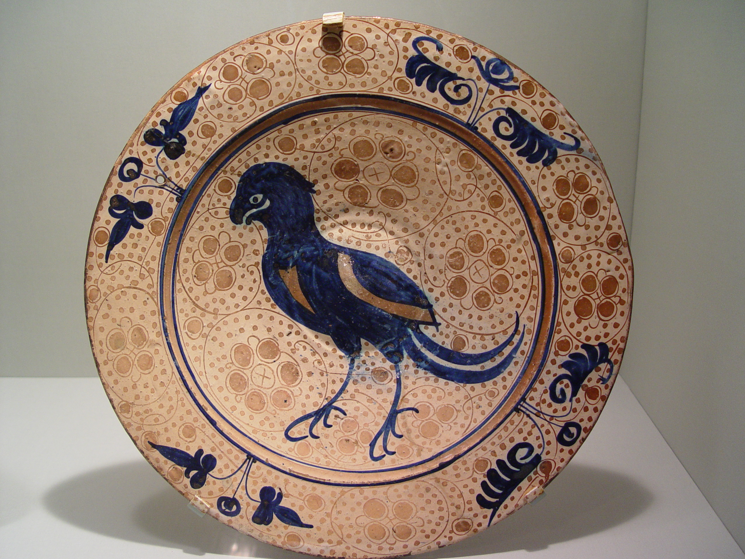 스페인의 히스파노-무어 도자기 제품은 처음에 알-안달루스에서 생산되었지만, 이슬람 도공들은 기독교 발렌시아 지역으로 이주하여 유럽 전역의 기독교 엘리트에게 수출된 작품을 제작했다.[25] 다른 종류의 이슬람 사치품, 특히 실크 직물과 카펫은 일반적으로 더 부유한[26] 동부 이슬람 세계 자체에서 유래했다(그러나 나일 강 서쪽의 이슬람 채널은 더 부유하지 않았다).[27] 대부분의 경우, 실크, 상아, 보석과 같은 궁정 문화의 사치품은 미완성 형태로 유럽으로 수입되어 현지 중세 장인들에 의해 "동양"으로 표기된 최종 제품으로 제조되었다.[29] 그들은 종교적 장면 묘사가 없고 일반적으로 장식으로 장식되어 있어 서양에서 쉽게 받아들여졌다.[30] 중세 후기에는 서양 미술에서 장식적으로 사용된 아랍 서체의 가짜 쿠피 모방이 유행했다.