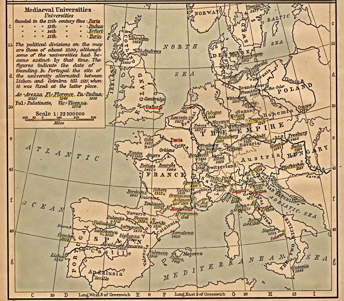 중세 대학교 지도. 이들은 과학 공동체에 필요한 새로운 인프라를 시작했다.