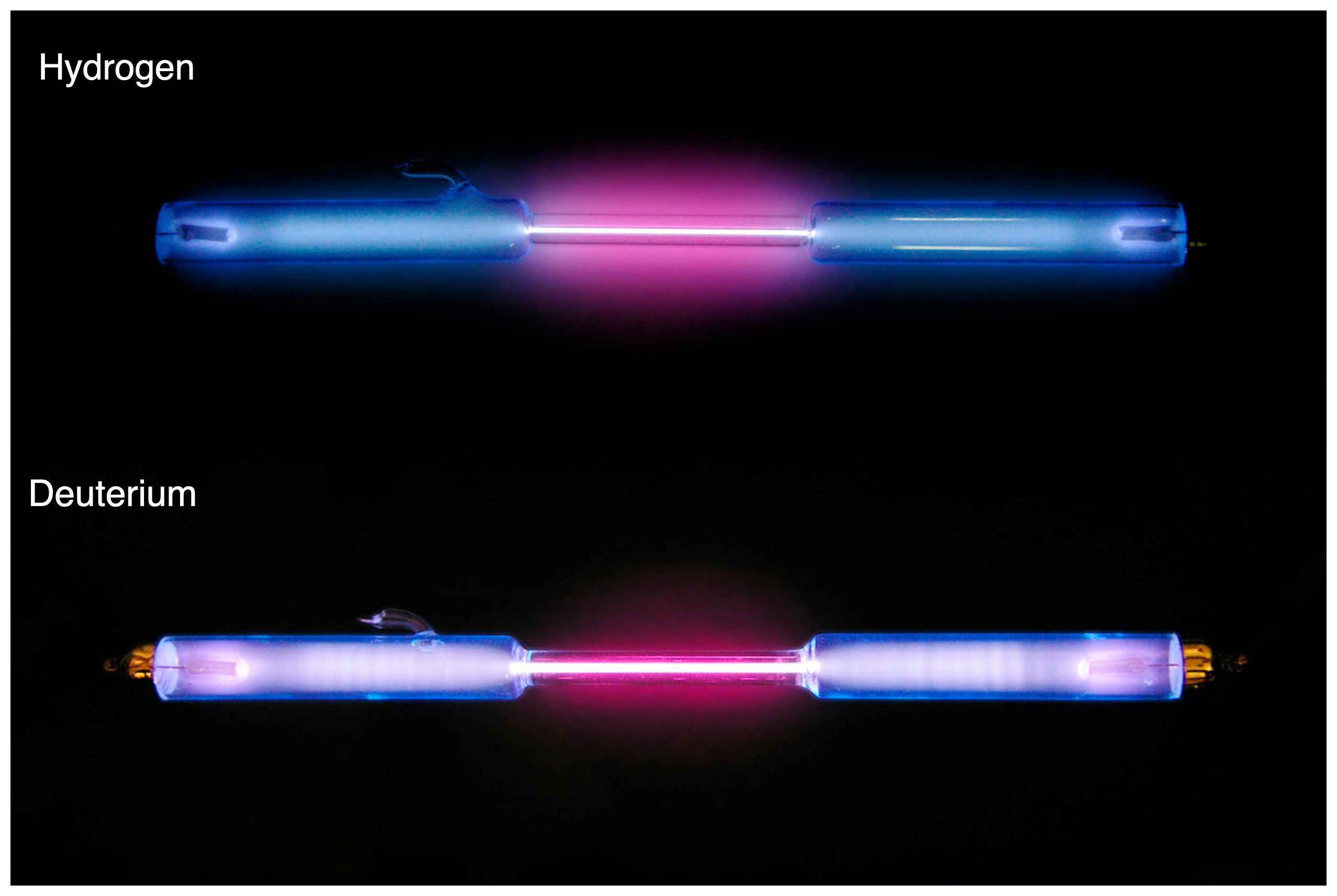 양자역학에서 원자 내 전자의 에너지 준위는 전자와 핵의 계의 환산 질량에 따라 달라진다. 수소 원자의 경우, 환산 질량은 원자의 보어 모형에서 가장 간단하게 나타나는데, 리드베리 상수와 리드베리 방정식 계산에 나타나지만, 슈뢰딩거 방정식과 디랙 방정식에도 나타난다.[8]이러한 방정식에서 계의 환산 질량은 단일 전자의 질량에 가깝지만, 전자의 질량과 핵의 질량의 비율과 거의 같은 작은 양만큼 다르다. 1H의 경우 이 값은 1.000545이고, 2H의 경우에는 1.0002725로 더 작다. 따라서 2H와 1H에 대한 전자 스펙트럼 선의 에너지는 이 두 숫자의 비율인 1.000272만큼 다르다. 모든 중수소 분광선 파장은 대응하는 경수소의 선보다 0.0272% 짧다. 천문 관측에서 이것은 광속의 0.0272% 또는 81.6 km/s의 청색 도플러 이동에 해당한다.[8]