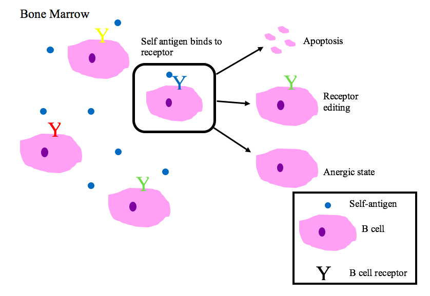 과정 | 미성숙 B 세포는 골수에서 자가 항원과 상호 작용한다. 자가 항원에 강하게 결합하는 B 세포는 다음 중 하나의 운명을 겪는다. 세포 사멸 (음성 선택) 수용체 편집: 경쇄 유전자를 재배열하여 자가 반응성을 제거한다. 무반응성: 자가 항원에 반응하지 않는 상태가 된다. |