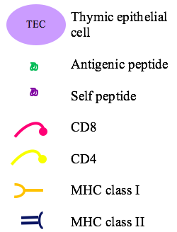 과정 | 미성숙 T 세포 (흉선 세포)는 흉선 상피 세포에 의해 제시되는 자가 항원과 상호 작용한다. 자가 항원에 강하게 결합하는 T 세포는 세포 사멸 (음성 선택)을 겪는다. 일부 T 세포는 조절 T 세포(Treg)로 분화되어 말초 관용에 기여한다. |
