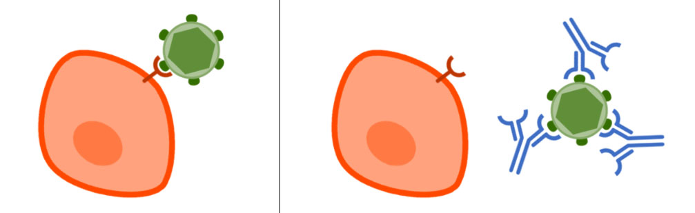 병원체는 표면 분자를 사용하여 표적 세포의 세포 표면 수용체와 상호작용, 세포에 들어가 복제 주기를 시작한다.[4] 중화 항체는 병원체의 특정 부위(항원)에 결합, 세포 진입에 필요한 핵심 분자 기능을 억제하거나, 세포 수용체와의 결합을 방해하여 감염을 막는다. 바이러스 감염의 경우, 외피 바이러스의 당단백질이나 비외피 바이러스의 캡시드 단백질에 결합할 수 있다.