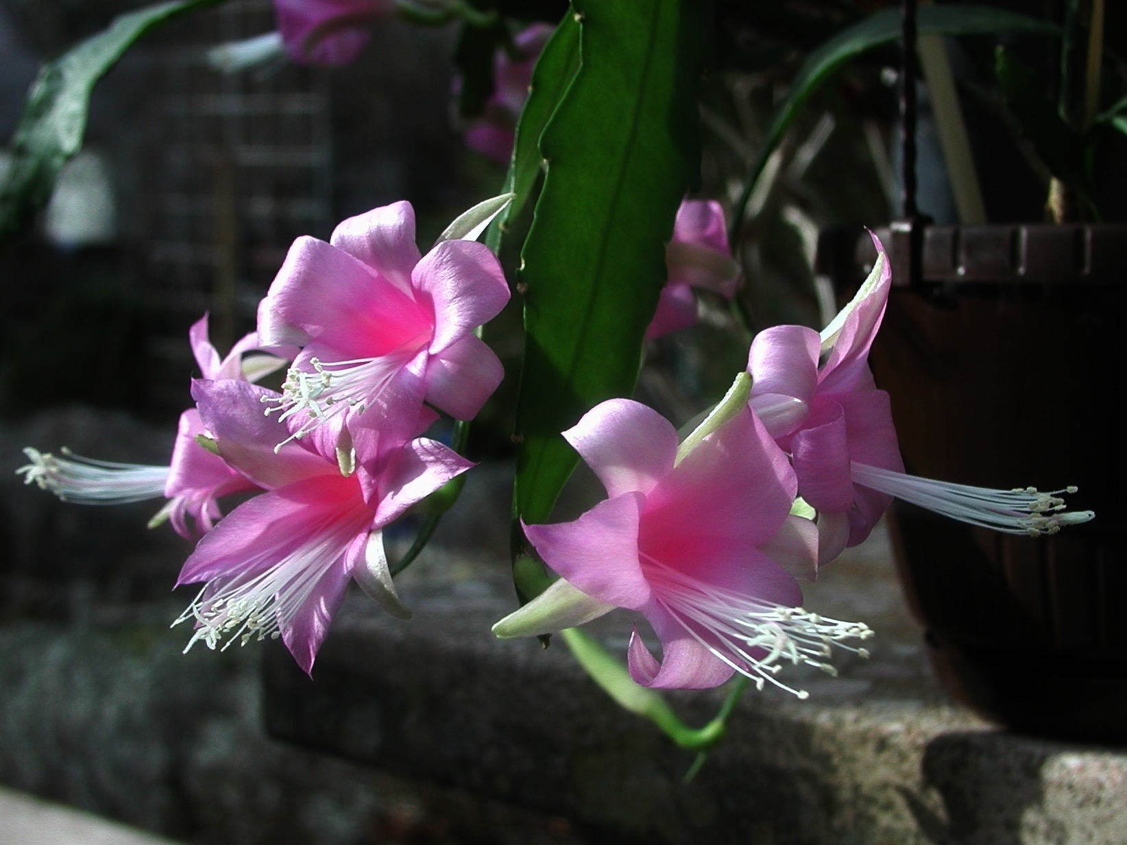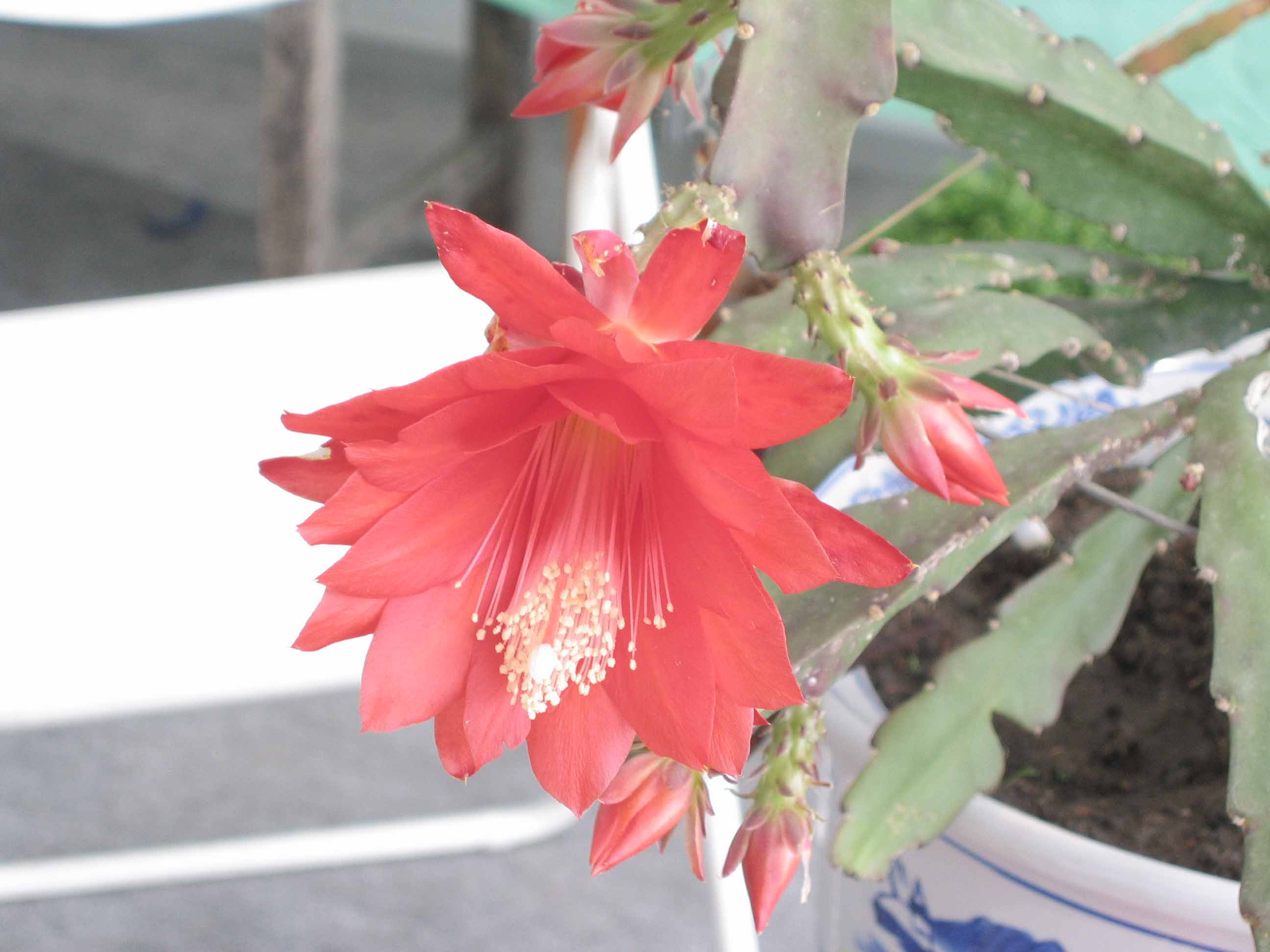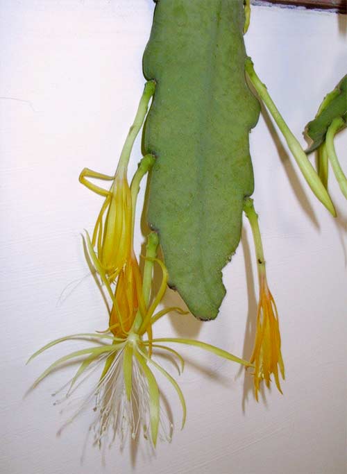 커다란 꽃은 낮 동안에 피며, areole에서 단독으로 또는 드물게 무리지어 나타난다. 꽃은 다양한 모양과 크기를 가지며, 길이는 10–15cm이다. 꽃은 깔때기 모양 또는 튜브 모양이며, 때로는 좌우대칭을 이루고 드물게 바퀴 모양이며, 꽃받침 튜브는 구부러져 있고, 잎 모양의 비늘 또는 1~소수의 강모(3–5mm)로 감싸여 있다. 색상은 밝은 빨간색, 주황색, 약간 붉은 분홍빛 주황색, 옅은 노란색 또는 흰색이다. 수술은 종종 두 줄로 배열되며, 위쪽 수술은 때때로 뚜렷한 목 부분을 형성한다. 꽃덮이의 꽃받침 부분은 길이가 10–30mm이고 폭이 3–7mm로 황록색이며, 꽃잎 부분은 길이가 6–8cm이고 폭이 1.5–2cm로 주황색이며 기저부는 붉은색이다. 수술은 꽃덮이 목 부분의 아래쪽에 비대칭적으로 모여 있으며, 암술대는 밖으로 튀어나와 있고, 길이는 9–13cm이며 8–9개의 주두 열편을 가지고 있다.
