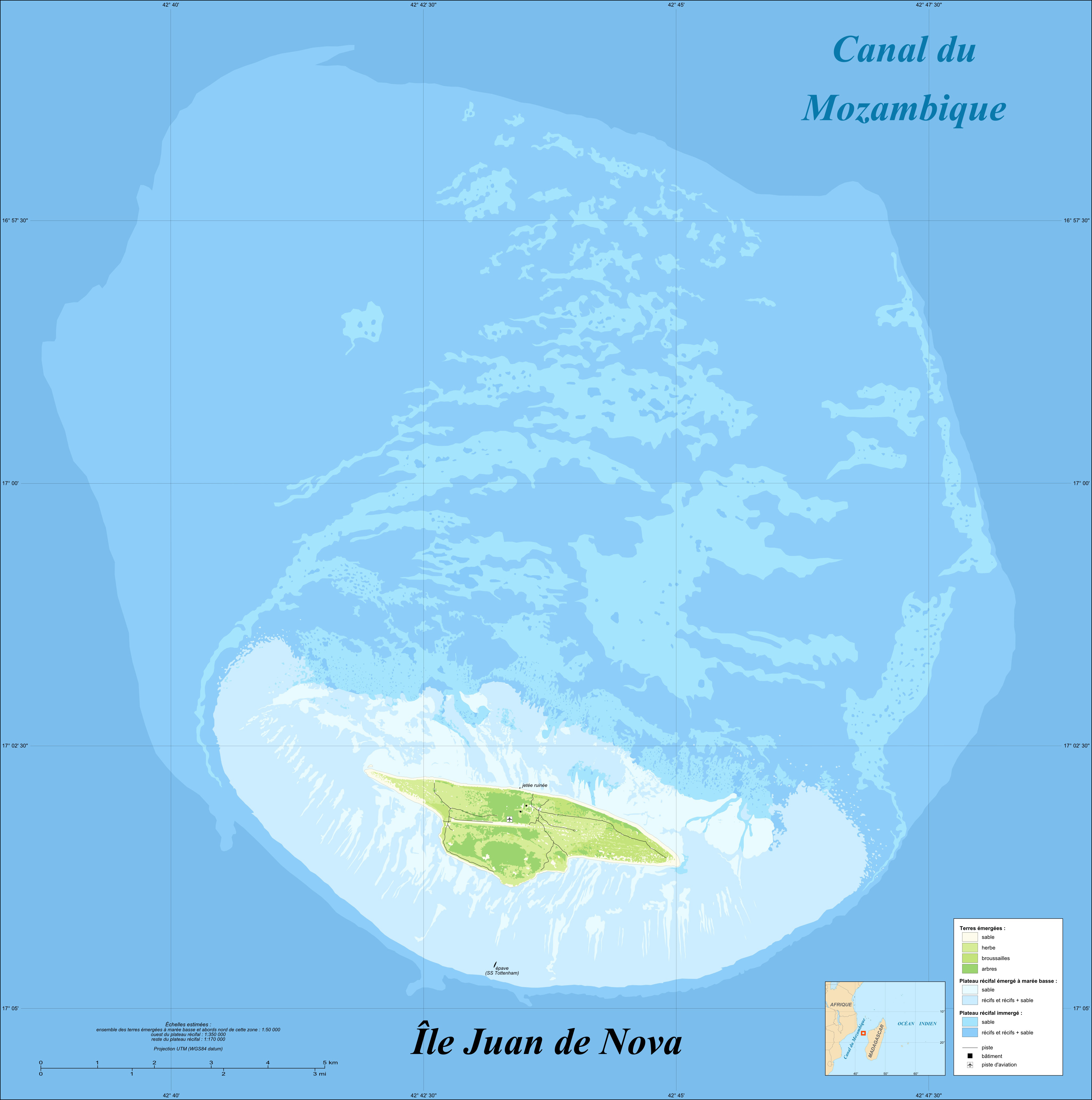 쥐앙드노바섬은 모잠비크 해협에 위치한 프랑스령의 섬으로, 마다가스카르에서 140km 떨어져 있다. 산호초와 사구로 이루어져 있으며, 열대 사바나 기후를 보인다. 1501년 포르투갈 탐험가 주앙 다 노바에 의해 발견되었으며, 이후 구아노 채굴, 인산염 채굴, 기상 관측소 운영 등 다양한 역사를 거쳤다. 1974년 프랑스가 마다가스카르의 영유권 주장에 대응하여 군대를 주둔시켰으며, 현재는 자연 보호 구역으로 지정되어 생물 다양성을 보호하고 있다. 섬 주변 해역에서는 탄화수소 탐사가 진행되었으나, 2019년 자연 보호 구역 지정으로 중단되었다. 쥐앙드노바섬은 중요 조류 지역으로 지정되었으며, 다양한 침입종과 난파선의 흔적이 존재한다.