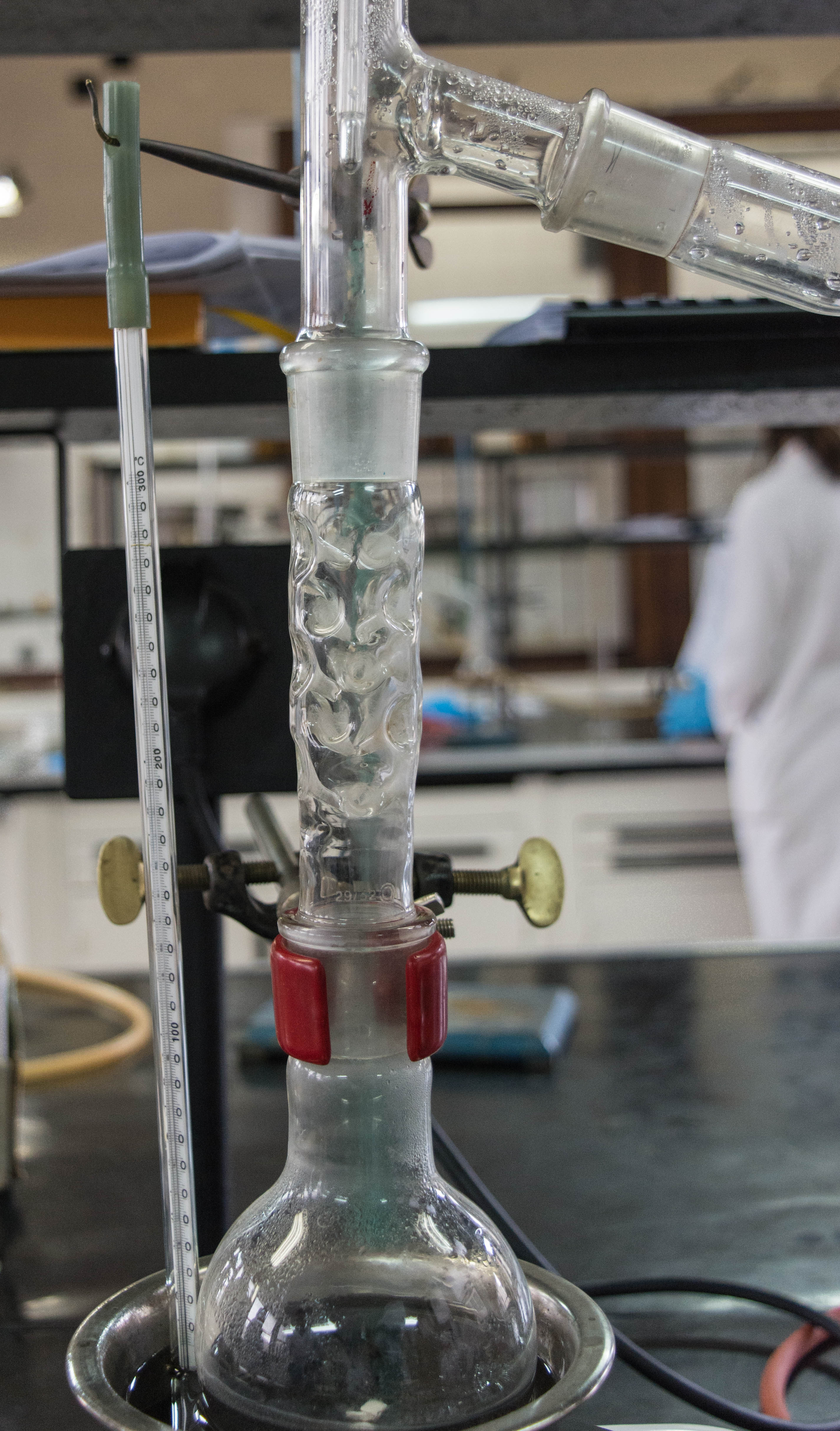 소규모 실험에는 T자관이 사용되며, 플라스크를 가열하고 리비히 냉각기를 연결한다. K자관(클라이젠 헤드)은 T자관 대신 사용되기도 한다. 끓는점이 높은 액체는 알린 냉각기나 리비히-그래함 냉각기를 사용하고, 끓는점이 낮은 액체는 냉각된 부동액이나 듀어 냉각기를 사용한다. Y자 어댑터나 퍼킨 삼각뿔은 각 유분을 분별 포집하는 데 사용된다. 정류가 필요한 경우에는 비그뢰 컬럼이나 회전 밴드 컬럼이 사용된다.[1]