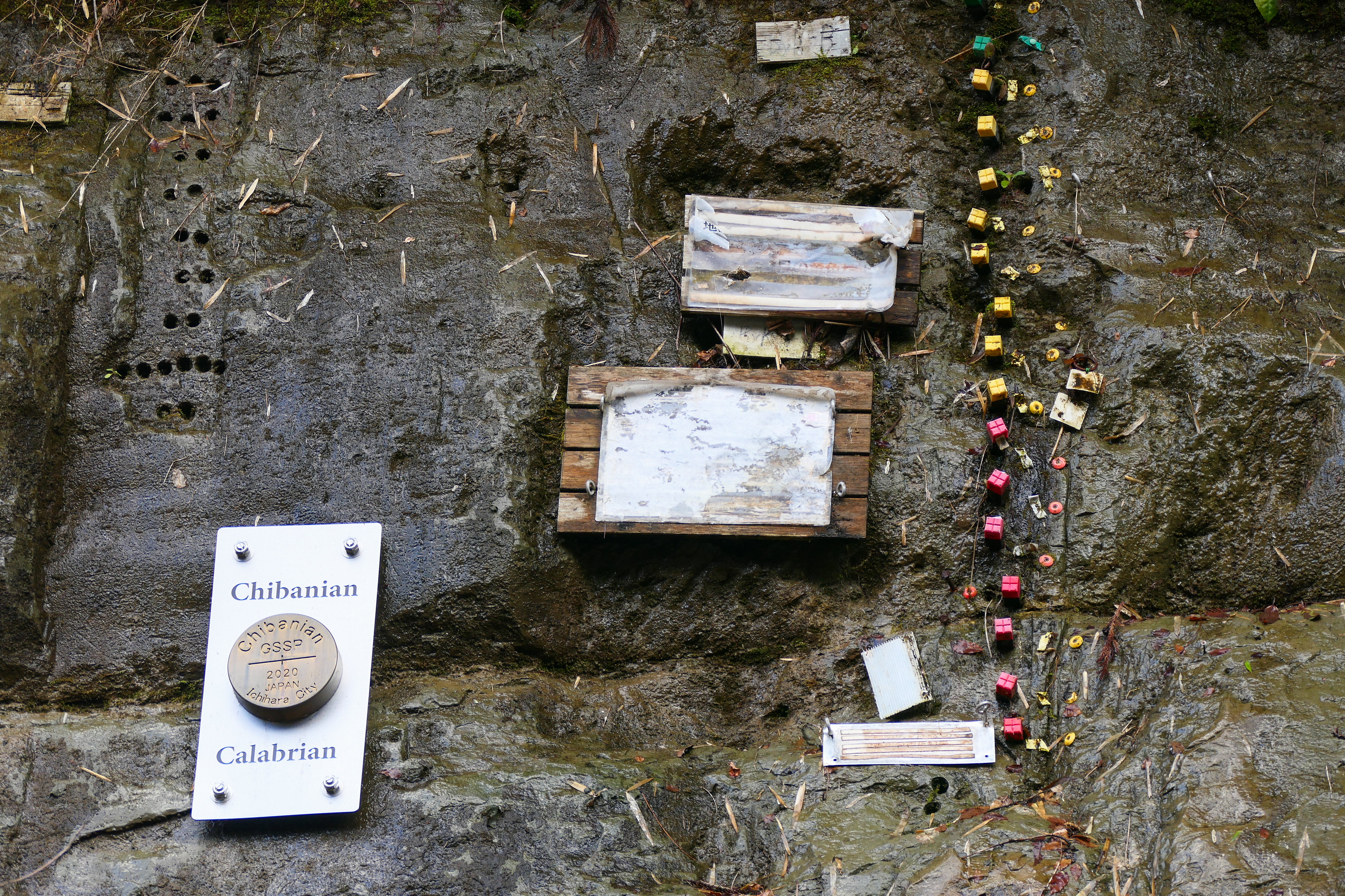 칼라브리아절과 치바절의 경계는, 지구사상 마지막 지자기 역전인 마쓰야마-브륀 역전이 일어난 시기이다[38]. 이를 나타내는 국제 표준 단면 및 지점의 후보로, 일본・지바현이치하라시다부치의 요로강을 따라 있는 「지바 단면」,[39] 이탈리아・바실리카타주마테라현의 「몬탈바노 이오니코 단면」,[40] 이탈리아・칼라브리아주크로토네현산마우로마르케자토의 「발레 데 망케(Valle di Manche) 단면」[41]의 3곳 지층이 거론되었다.[38]