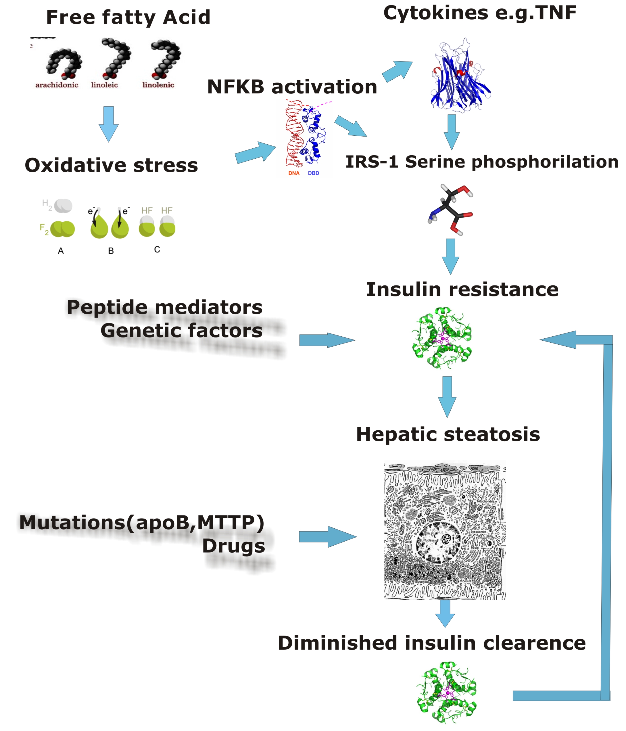 지방산 대사의 결함은 지방간 질환을 일으키는 원인이 될 수 있다. 이는 에너지 소비와 연소의 불균형으로 인해 지질이 저장되거나, 지방 조직에서 간으로 지방산 수송이 증가하는 말초 인슐린 저항성의 결과일 수 있다.[13][20] 지방산의 산화 및 합성을 조절하는 수용체 분자(PPAR-α, PPAR-γ, SREBP1)의 손상 또는 억제가 지방 축적에 영향을 주는 것으로 보인다. 또한, 알코올 사용 장애는 미토콘드리아 및 기타 세포 구조를 손상시켜 세포 에너지 메커니즘을 더욱 악화시킨다. 비알코올성 지방간 질환은 간세포 내 대사되지 않은 에너지의 과잉으로 시작될 수 있다. 간 지방증은 근본적인 원인이 줄거나 제거되면 어느 정도 회복될 수 있고 진행되지 않을 수 있다.