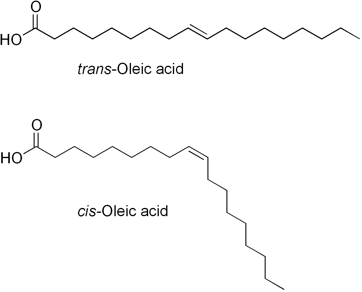 시스형: 시스형은 이중 결합에 인접한 두 개의 수소 원자가 같은 쪽에 위치한다. 시스형 불포화 지방산은 사슬이 구부러져 유연성이 떨어지며, 이중 결합이 많을수록 더 많이 구부러진다. 예를 들어, 올레산은 한 개의 이중 결합으로 "구부러짐"이 있고, 리놀레산은 두 개의 이중 결합으로 더 뚜렷하게 구부러진다. α-리놀렌산은 세 개의 이중 결합으로 갈고리 형태를 선호한다. 이러한 구조는 세포막, 지방의 녹는점에 영향을 줄 수 있다.[66][67][71][68]