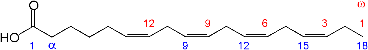 메틸기 말단(n 또는 ω)에서부터 번호를 매겨 x번째 탄소-탄소 결합에 이중 결합이 위치함을 나타낸다. α-리놀렌산은 n−3 지방산 또는 오메가-3 지방산으로 분류된다. IUPAC는 n−x 표기법을 선호한다.[70]