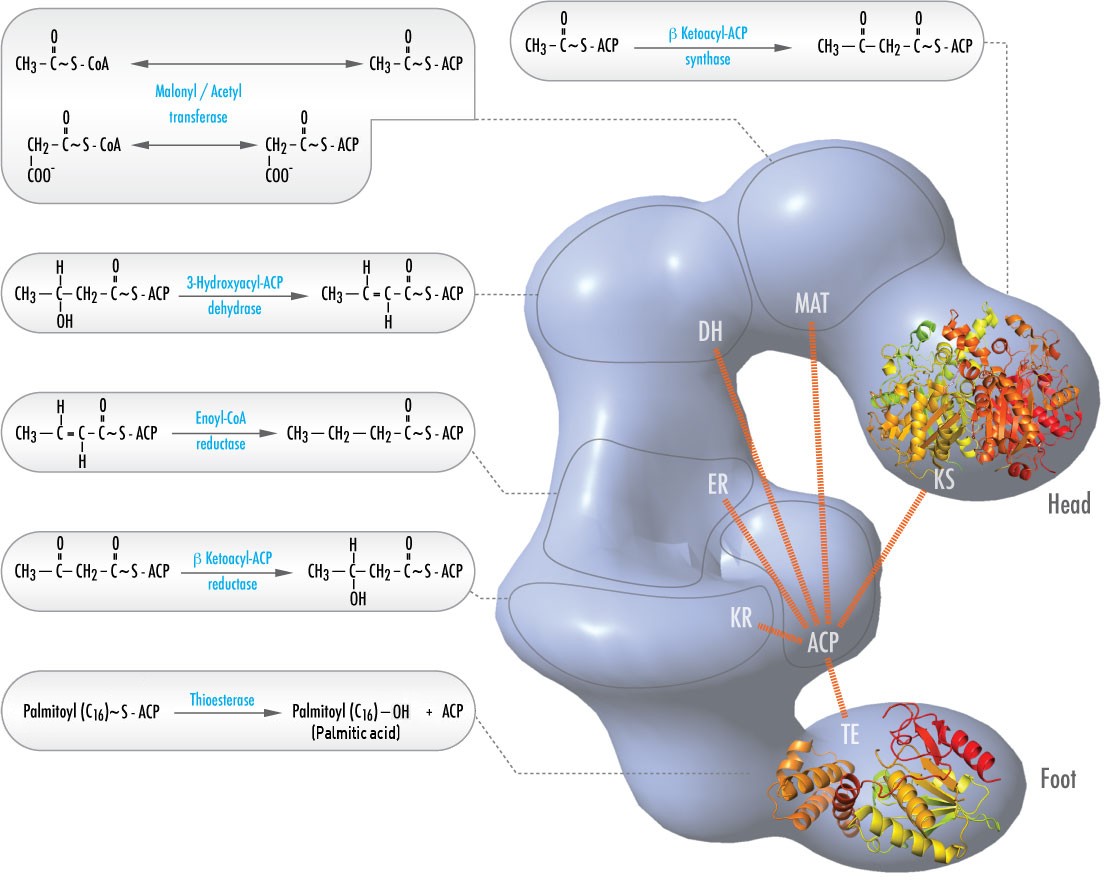 돼지(동종이량체)[22]와 효모 FAS(이종십이량체)[23]의 저해상도 X선 결정 구조와 ~6 Å 해상도 전자 극저온 현미경(cryo-EM) 효모 FAS 구조[24]가 밝혀졌다.
