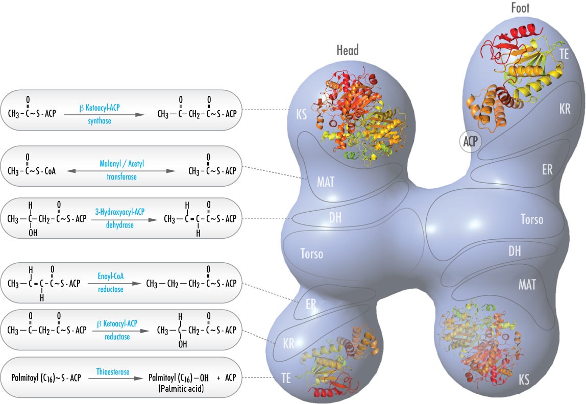 포유류 지방산 생성효소(FAS)는 두 개의 동일한 단백질 서브유닛의 동종이량체로 구성되어 있으며, N-말단 부분의 세 촉매 도메인(-케토아실 합성효소(KS), 말로닐/아세틸전이효소(MAT), 탈수소효소(DH))은 600개 잔기(도메인 간 영역)의 코어 영역과 네 개의 C-말단 도메인(에노일 환원효소(ER), -케토아실 환원효소(KR), 아실 운반 단백질(ACP), 티오에스테라제(TE))에 의해 분리된다.[13][14] 도메인 간 영역은 두 단량체 도메인이 이량체를 형성하도록 한다.[13]FAS 구성에 대한 기존 모델('머리 대 꼬리' 모델)은 이작용성 시약인 1,3-디브로모프로파논(DBP)이 한 FAS 단량체의 KS 도메인의 활성 부위 시스테인 티올을 다른 단량체의 ACP 도메인의 포스포판테테인 보결 분자와 가교 결합할 수 있다는 관찰에 기반한다.[15][16] 각 단량체에 서로 다른 돌연변이를 가진 FAS 이량체의 상호 보완 분석을 통해 KS 및 MAT 도메인이 두 단량체의 ACP와 협력할 수 있음이 밝혀졌다.[17][18] DBP 가교 결합 실험 재조사 결과, KS 활성 부위 Cys161 티올이 두 단량체의 ACP 4'-포스포판테테인 티올과 가교 결합될 수 있음이 밝혀졌다.[19] 또한, 최근에는 하나의 유능한 단량체만 포함하는 이종이량체 FAS가 팔미테이트 합성을 할 수 있다고 보고되었다.[20]