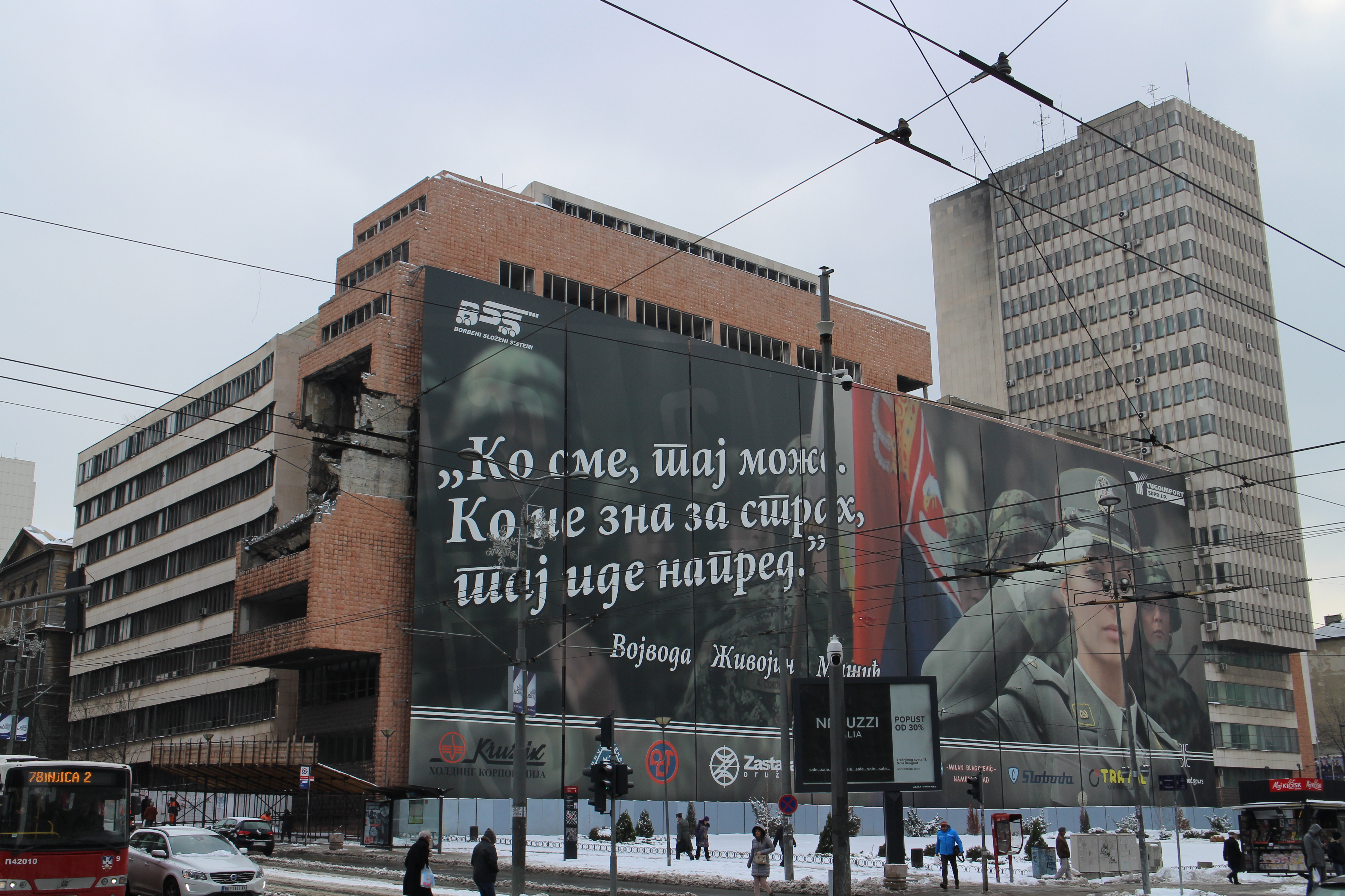 지보인 미시치의 인용문 중 하나가 적힌 베오그라드의 선전 게시판