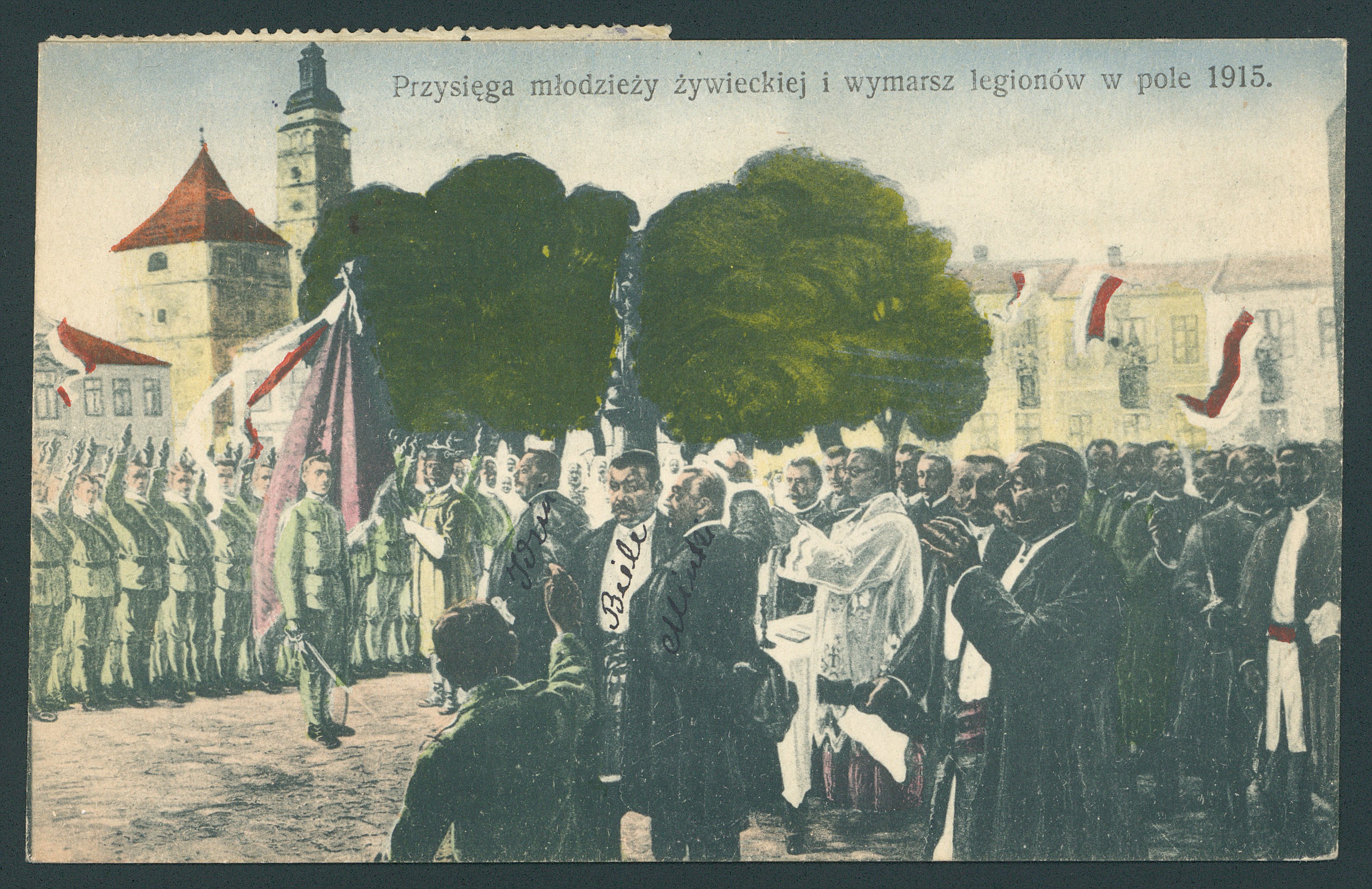 폴란드 군단이 제1차 세계 대전 중 지비에츠의 시장 광장에서 선서를 하고 있다.