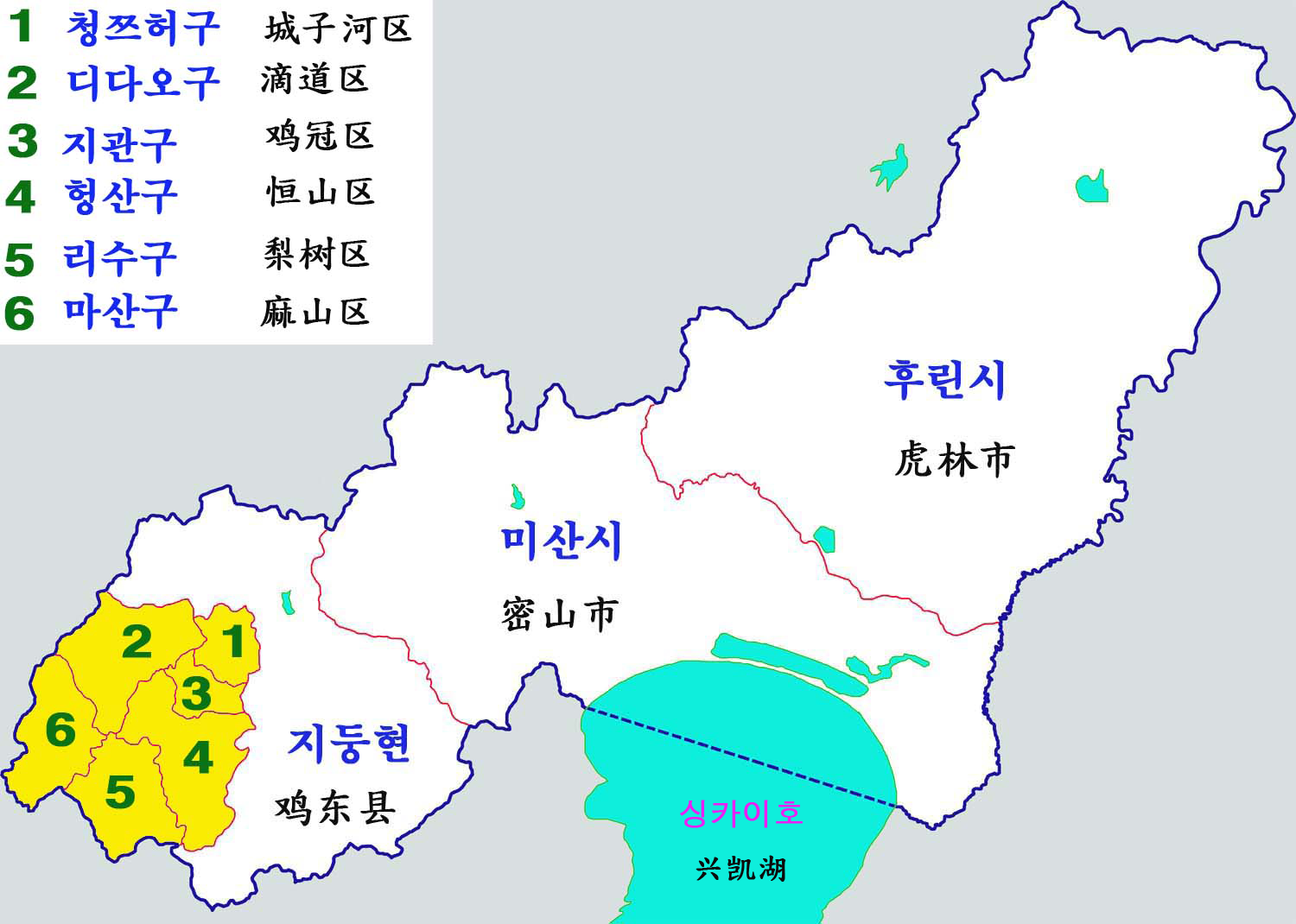 1956년 12월 18일 | 헤이룽장성 무단장 전구 지시현 · 무릉현 · 임구현의 일부를 합병, 지급시인 지시시 발족. 지관구 · 헝산구 · 디다오구 · 리수구 · 마산구 설치 (5개 구) |