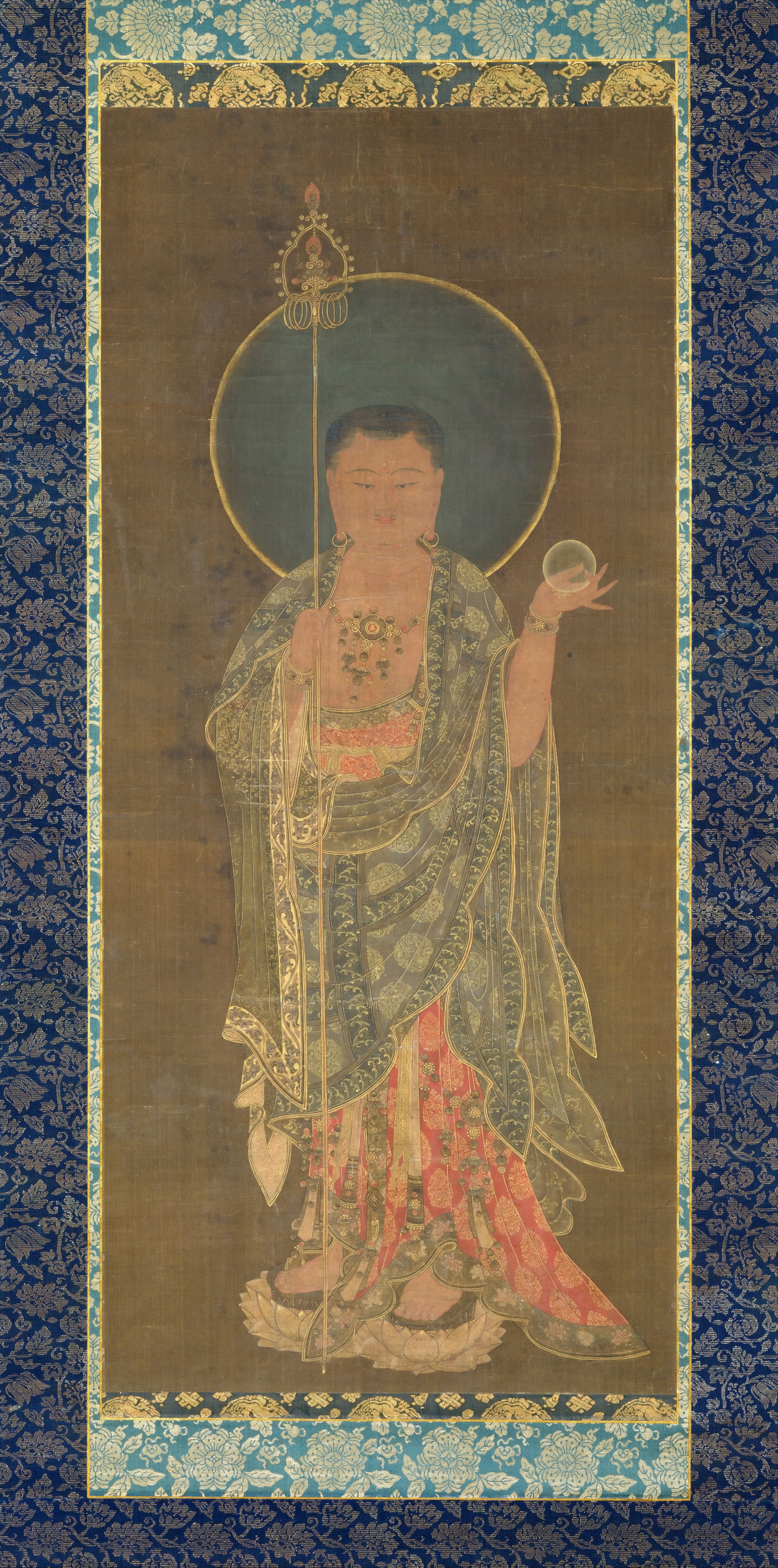 그러나 밀교에서는 태장만다라 지장원의 주존으로서, 머리를 높이 묶고 장신구를 착용한 보통의 보살형으로 표현되며, 오른손은 오른쪽 가슴 앞에서 일륜을 들고, 왼손은 왼쪽 허리에 대고 幢幡을 얹은 연화를 든다.
