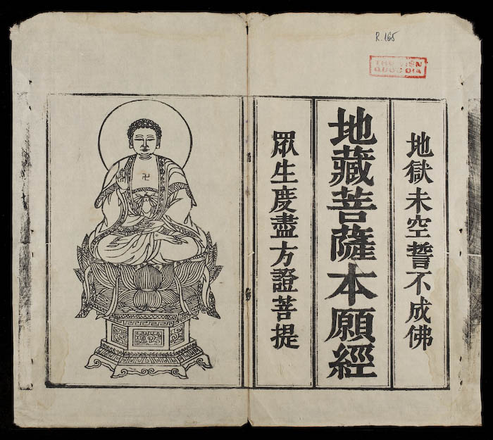 지장보살 이야기는 대승 경전인 『지장보살본원경』에 처음 나오며, 부처가 어머니 마야를 위해 삼십삼천(Trāyastriṃśa)의 중생들에게 설했다고 전해진다.[3] 이 경전은 당나라 시대 석선난다(Śikṣānanda)가 산스크리트어에서 중국어로 번역했으나,[4] 일부 학자들은 중국 기원설을 제기하기도 한다.[5]