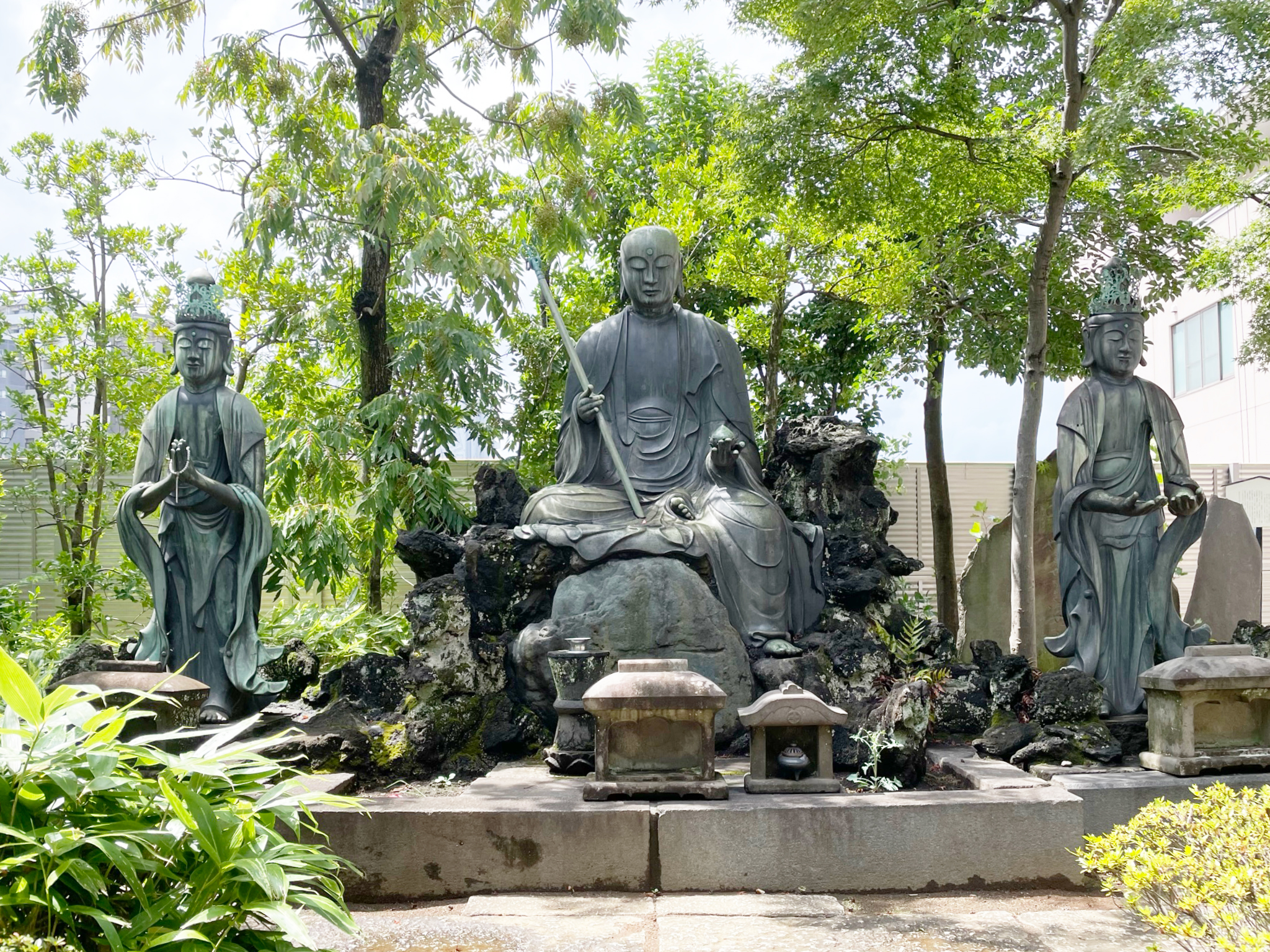 도쿄 고이시카와의 전통원 정문을 들어서 왼쪽에 있는 동상의 불상이다. 중앙의 본존불은 “법장지장존(法蔵地蔵尊)”이며, 협시불은 오른쪽이 관세음보살, 왼쪽이 세지보살이다. 이러한 조합의 삼존불은 이례적이다. 법장보살에서 불이 된 아미타불이 대중적인 신앙에서 친숙한 지장의 모습으로 나타난 것이다.[31][32]