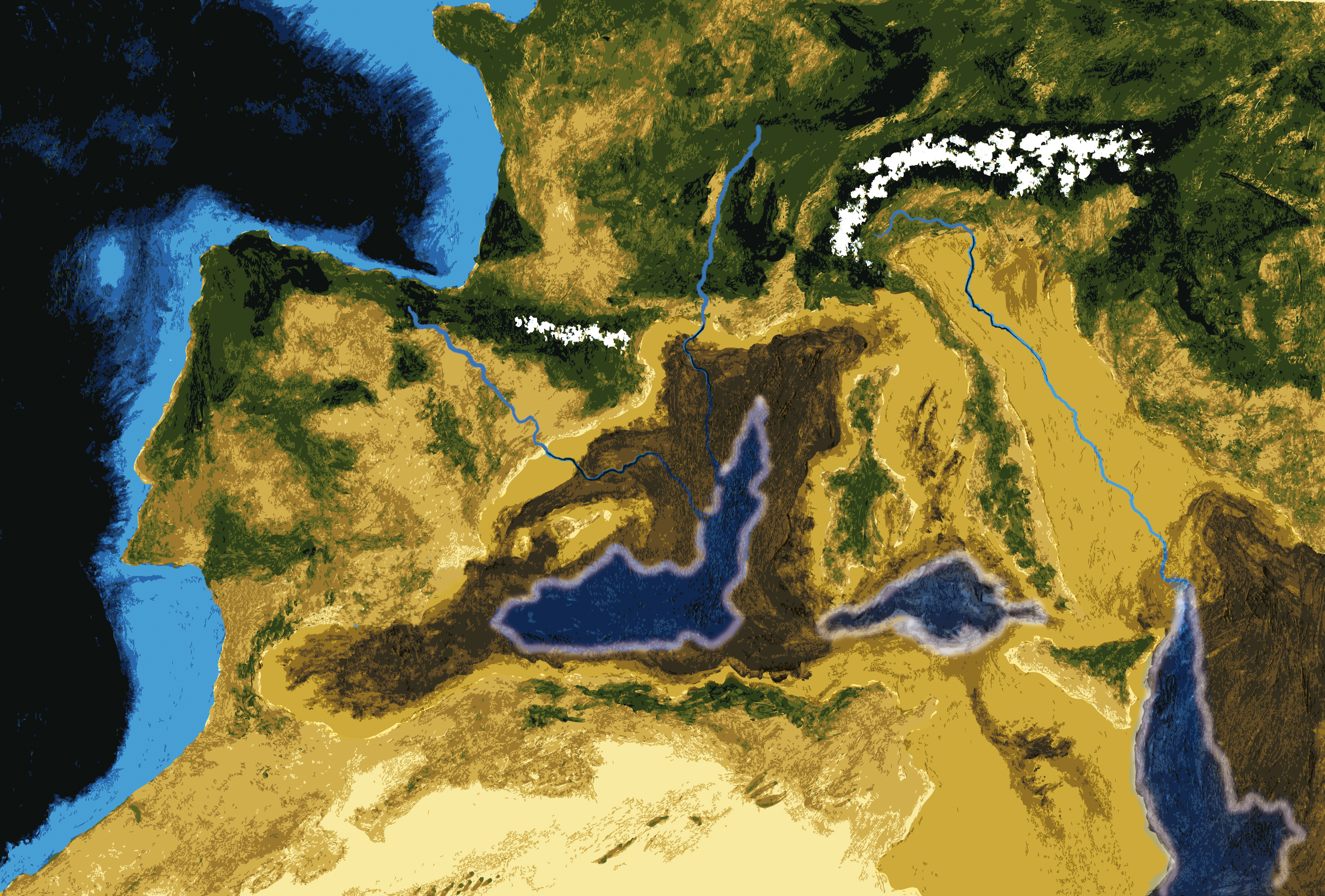 지중해 분지는 유럽, 아시아, 아프리카에 걸쳐 지중해성 기후를 나타내며, 알프스 조산 운동과 메시니안 염분 위기와 같은 지형 및 기후 변화를 겪었고, 네안데르탈인과 크로마뇽인의 거주지이자 농업 발상지로 밀, 올리브, 포도 등의 작물이 재배되는 지역이다. - 아프리카의 해역 - 알보란해