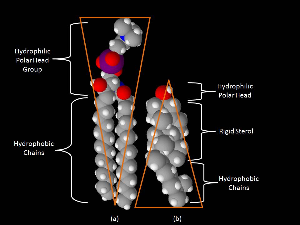 막 지질의 중요한 특성 중 하나는 양쪽성이다. 양쪽성 지질은 극성 친수성 머리 그룹과 비극성 소수성 영역을 가진다.[9] 위 그림은 소수성 및 친수성 영역이 차지하는 공간의 면적을 기준으로 스핑고마이엘린의 역원뿔 모양과 콜레스테롤의 원뿔 모양을 보여준다. 콜레스테롤은 뗏목의 지질 사이에 뭉쳐 분자 간격체 역할을 하고 관련 스핑고지질 사이의 빈 공간을 채운다.[9]