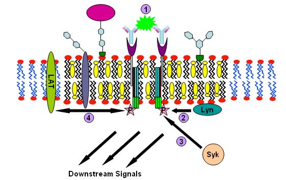 4. Syk 계열 티로신 키나아제가 ITAM의 인산화된 티로신 잔기에 결합하여 신호 전달 캐스케이드를 시작한다.[40]