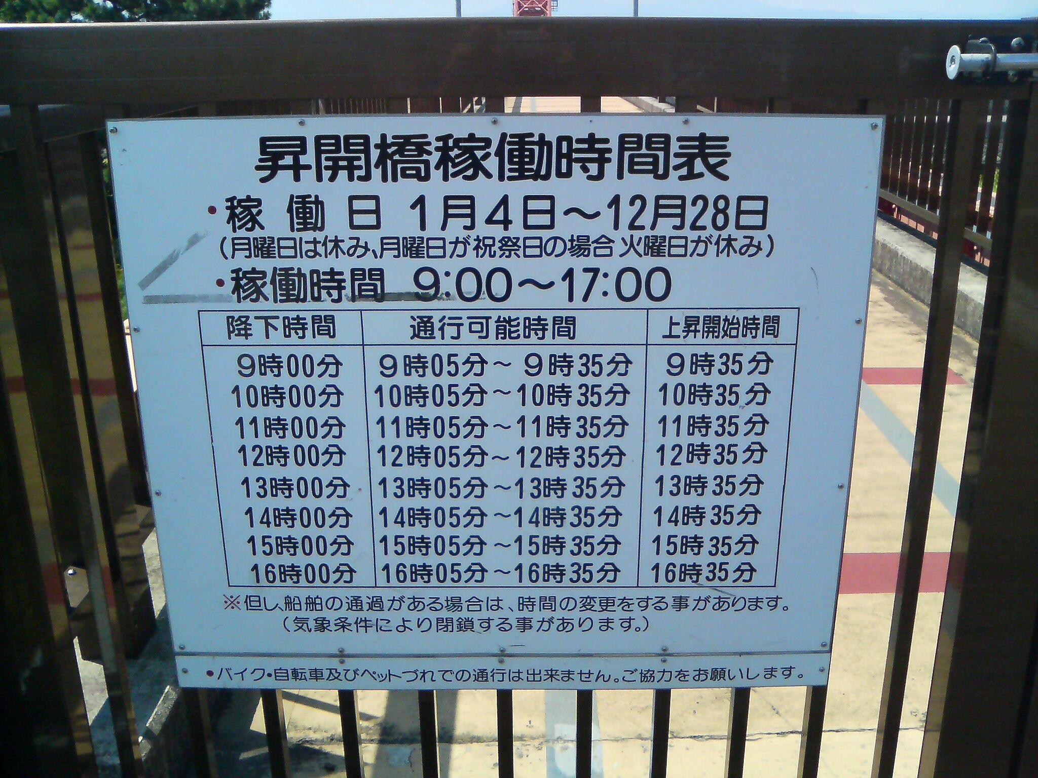 승개교는 정해진 시간에 따라 다리가 오르내리는 모습을 볼 수 있는 관광 명소로, 통행은 무료이다. 다리 양쪽에는 주차장이 있으며, 사가현 쪽에는 특산물 직판장 "다리의 역 도론파"가 있다. 애완동물 동반이나 오토바이 진입은 제한되며, 자전거는 내려서 끌고 가야 한다.