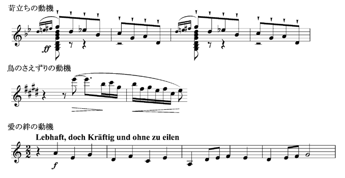 짜증의 동기에서 새소리 동기, 사랑의 유대 동기로 변형되는 과정