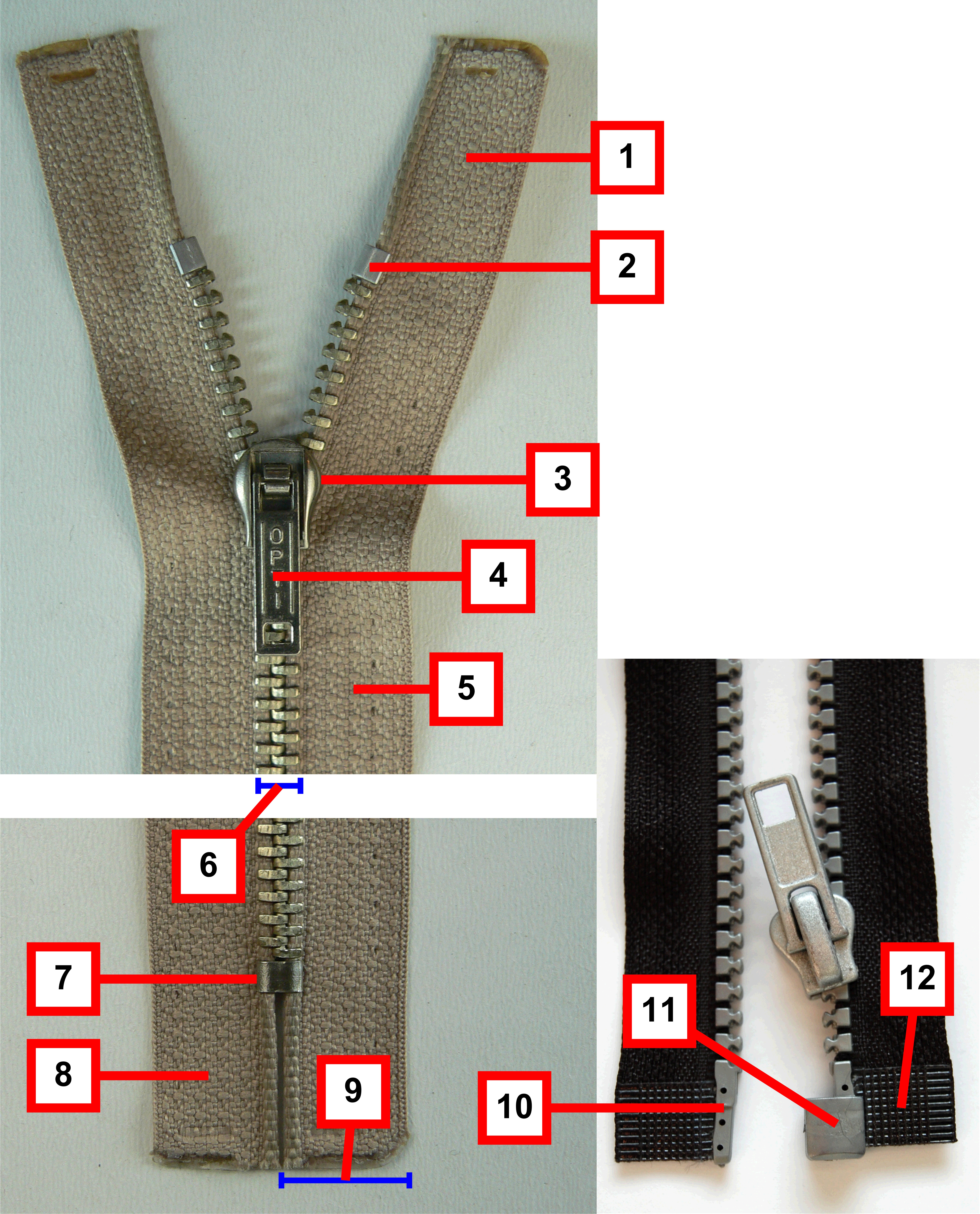 지퍼는 '''테이프''', '''엘리먼트(무치)''', '''슬라이더(개폐 부품)'''로 구성된다.[3]